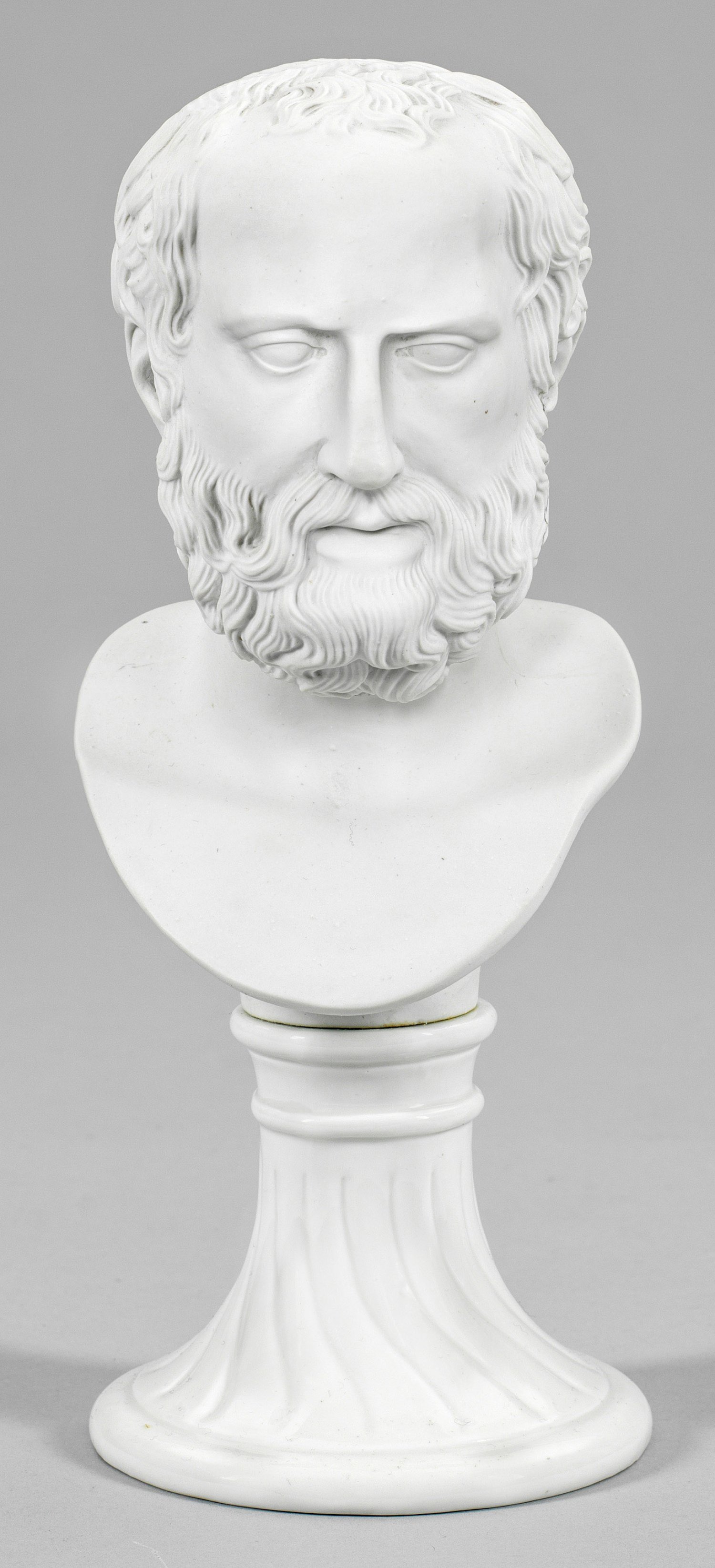 Über hochgezogenem, glasierten Rundsockel die Büste des Hippokrates von Kos, altgriechischer Mediziner aus Biskuitporzellan. Entw. Carl Gottlieb Schubert, um 1781 in fünf Größen modelliert. Rücks. Namensbez. sowie eingepresstes, springendes Pferd mit "W" für den Former Johann Heinrich Wegener (tätig 1758 - 1798) sowie Nr. 4 (Größenangabe). Brandriss. Best.; Manufakturmarke mit eingeritztem "S". H. 27 cm.