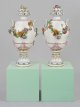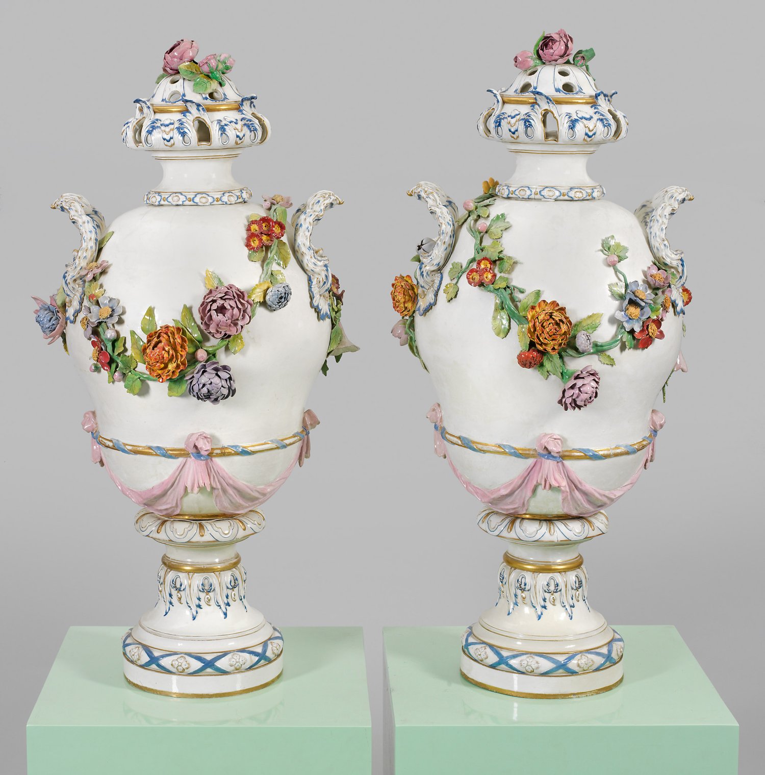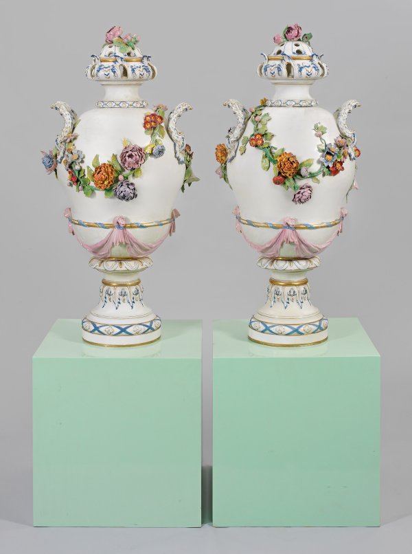 A pair of monumental lidded vases with applied flower decor from courtly property. Sceptre mark.