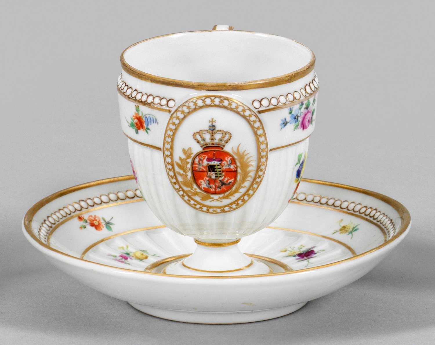 mit Untertasse. Glockenbecherförmiger Korpus mit hochgezogenem, gekantetem Henkel. Umlaufender Rippen- und Perlstabfriesdekor mit feiner, bunter Blumenmalerei. Schauseitig in ovalem Medaillon polychromes polnisch-litauisches Königswappen mit dem kursächsischen Wappen. Goldrand. Schwertermarke. Gold teilw. minim. ber.; Tassen-H. 10 cm.