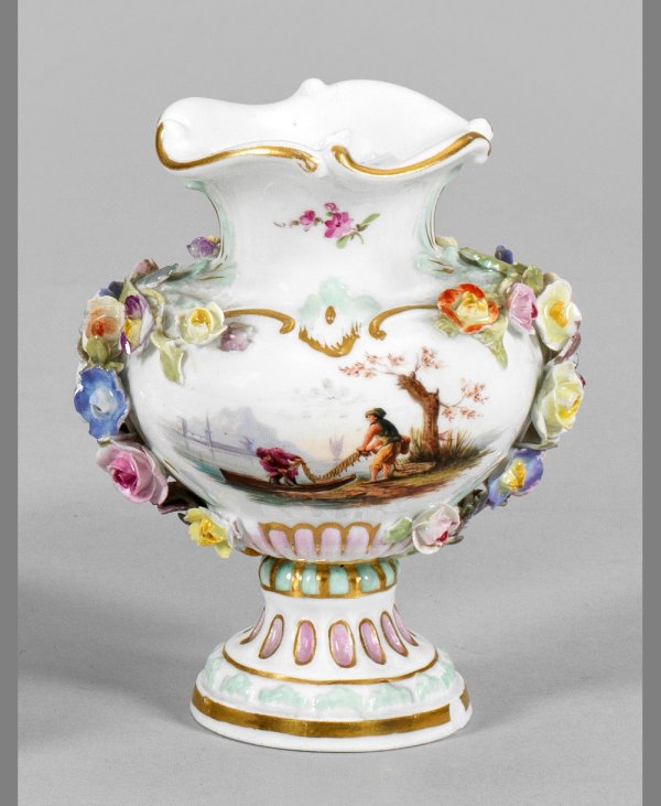 Gedrückte Balusterform. Rocaille- und Godronenrelief sowie plastisch aufgelegte Blumenranken. Beidseitig der Wandung Genreszene bzw. Blumenbukett. Polychrome Malerei. Goldstaffage. Best.; Schwertermarke. H. 10 cm.