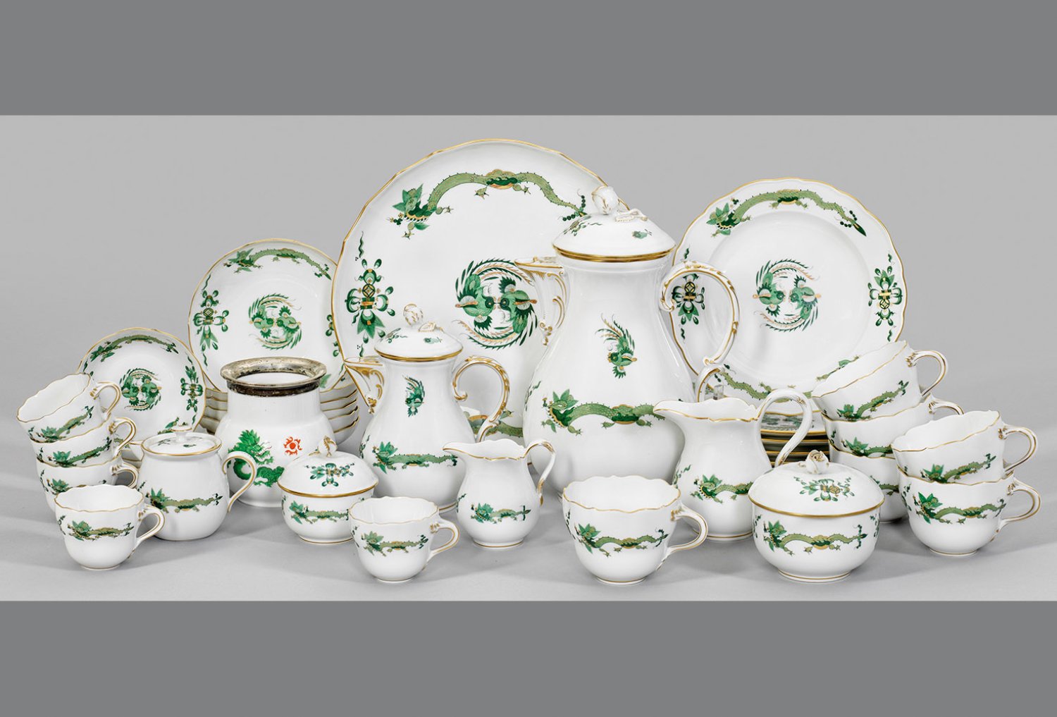 26-tlg.; Kaffee-, Mokkakanne, 3 Sahnegießer, 2 Zuckerdosen, 6 Kaffee-, 4 Mokkatassen mit Untertassen, 6 Kuchenteller, Tafelaufsatz und Gebäckschale. Dekor "Reicher Drache" in Grün. Polychrome Malerei mit Goldstaffage. Beigabe: Mokkatasse, Vase mit Dekor "Mingdrache" und 800er Silbermontierung. Teilw. unw. best.; Schwertermarke. Kannen-H. 16,5 cm - 25,5 cm.