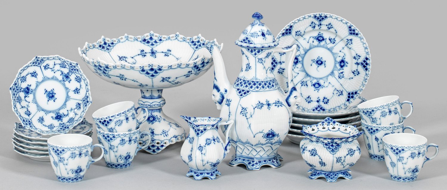 für sechs Personen. 16-tlg.; Mokkakanne, Sahnekännchen, Zuckerschale, 6 Mokkatassen mit Untertassen, 6 Konfektteller, Aufsatzschale. Reliefdekor "Gebrochener Stab" mit "Musselmalet Vollspitze"-Dekor in unterglasurblauer Malerei. Manufakturmarke. Teller-D. 14,5 cm, Schalen-H. 13,5 cm, Kannen-H. 21 cm.