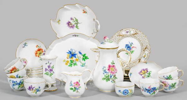 für 7 Personen. 21-tlg.; Kaffeekanne, Zuckerschale, Sahnegießer, 7 Kaffeetassen mit Untertassen, 7 Dessertteller mit durchbrochen gearbeitetem Rand, kleine Schale, Tablett, Vase, Blattschale. Farbenfroher Blumendekor in polychromer Malerei. Goldstaffage. Deckel Kaffeekanne minim. best., Gold minim. ber.; Schwertermarke. Kannen-H. 22,5 cm.