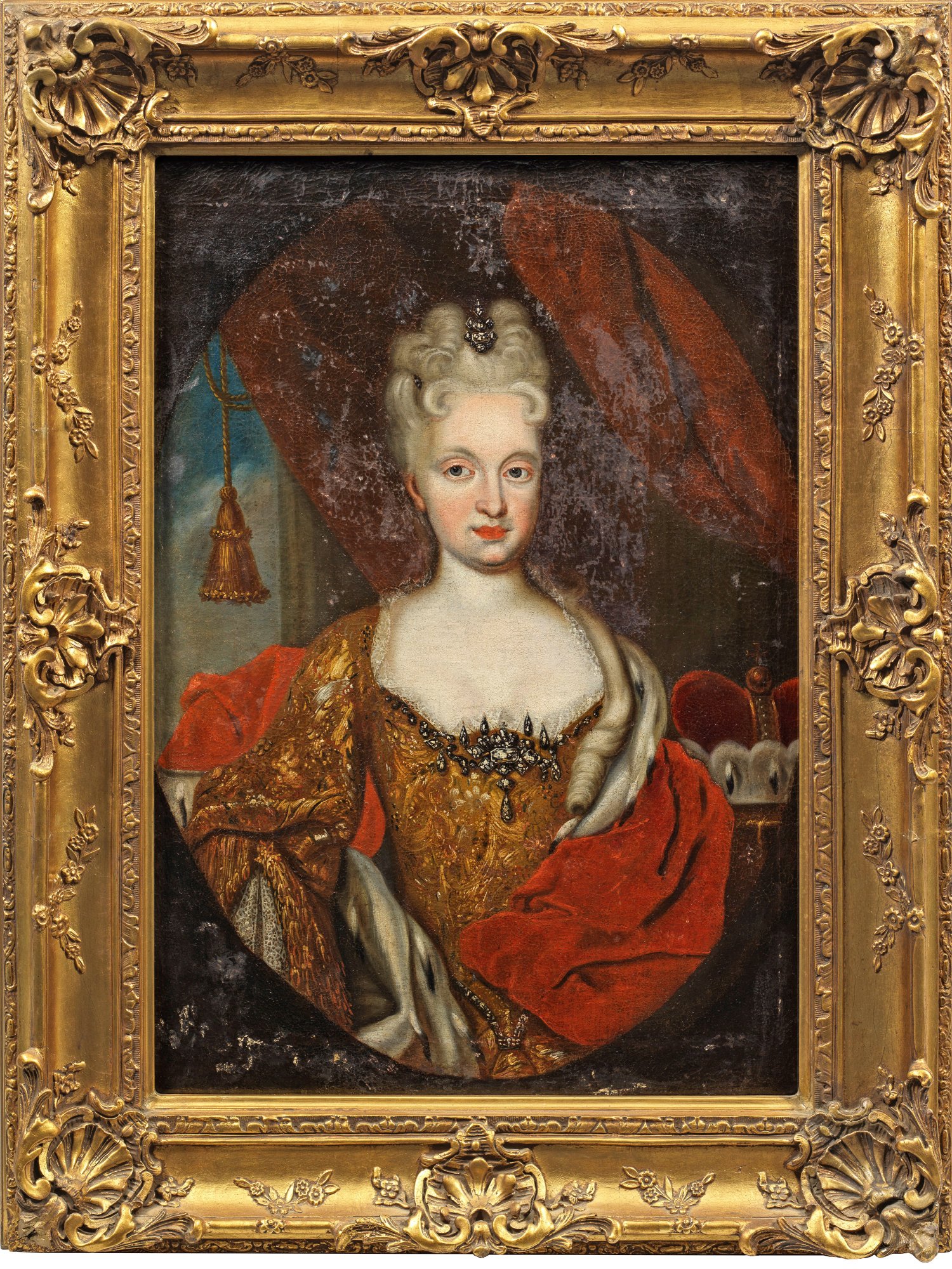 Repräsentationsgemälde mit ovalem Bildausschnitt, die Dargestellte beinahe en face in einem goldenen Kleid, am Saum des Dekolleté kostbarer Diamantschmuck, in ihrem turmartig frisierten Haar der berühmte "Blaue Wittelsbacher"-Diamant. Als Zeichen ihres Standes trägt sie einen umgelegten Hermelinmantel, neben ihr ein Fürstenhut. Maria Amalia, Tochter Kaisers Joseph I. (HRR), heiratete 1722 Kurfürst Karl Albrecht von Bayern, der 1742 als Karl VII. Kaiser des Heiligen Römischen Reichs Deutscher Nation wurde. Das Gemälde dürfte 1722 anlässlich der Hochzeit entstanden sein. Restaurierungsbedürftig. 92 cm x 72 cm. Rahmen.