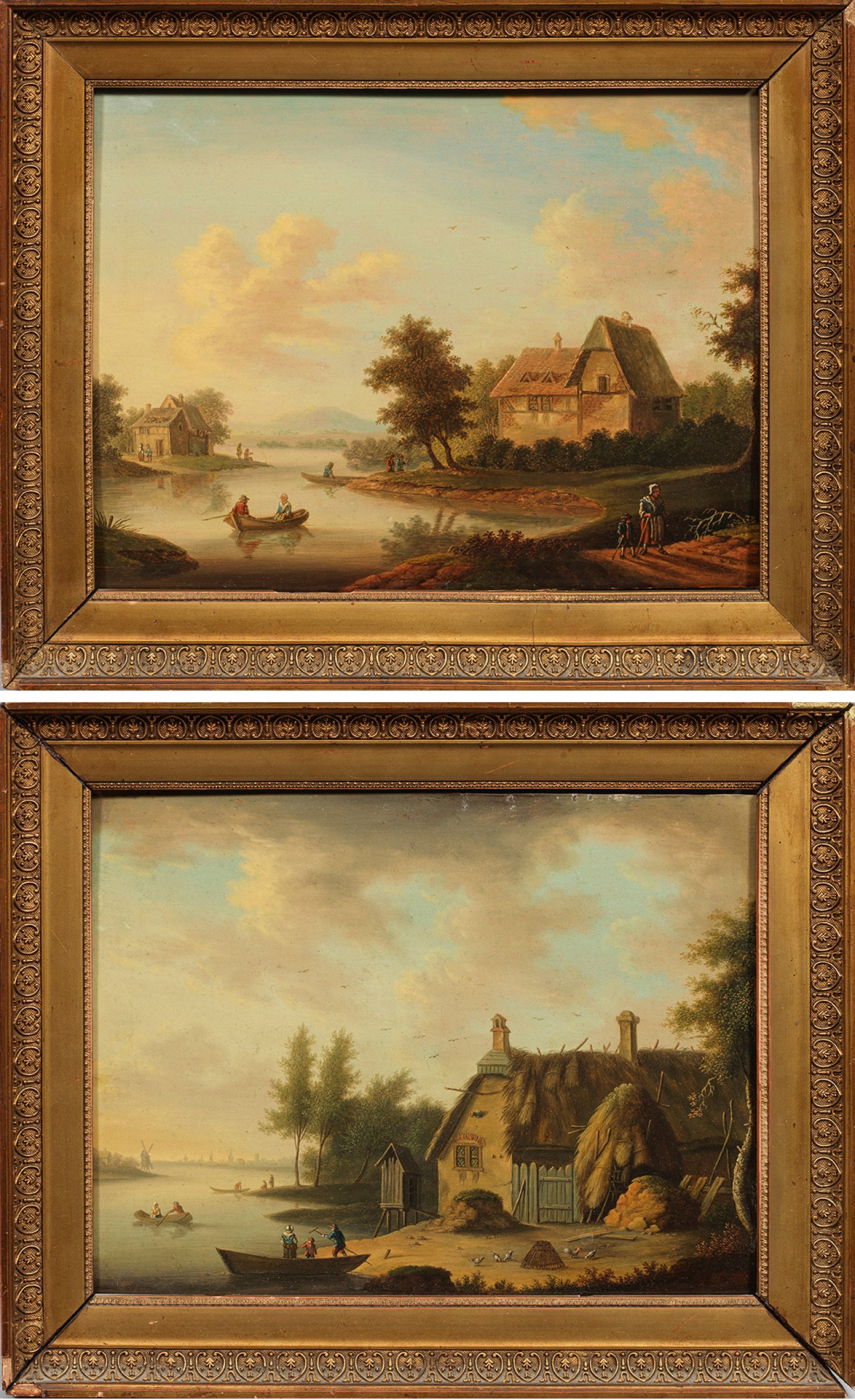 German landscape painter active circa 1800. A pair of river landscapes. Oil on panel.