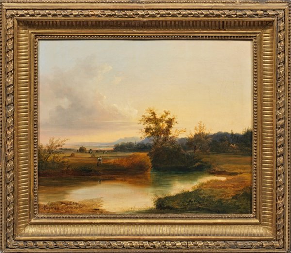 Spätsommerliche Landschaft in stimmungsvollem Kolorit. Öl/Lwd.; L. u. sign. und schwer leserlich dat. 1853(?). 34,5 cm x 42 cm. Rahmen.