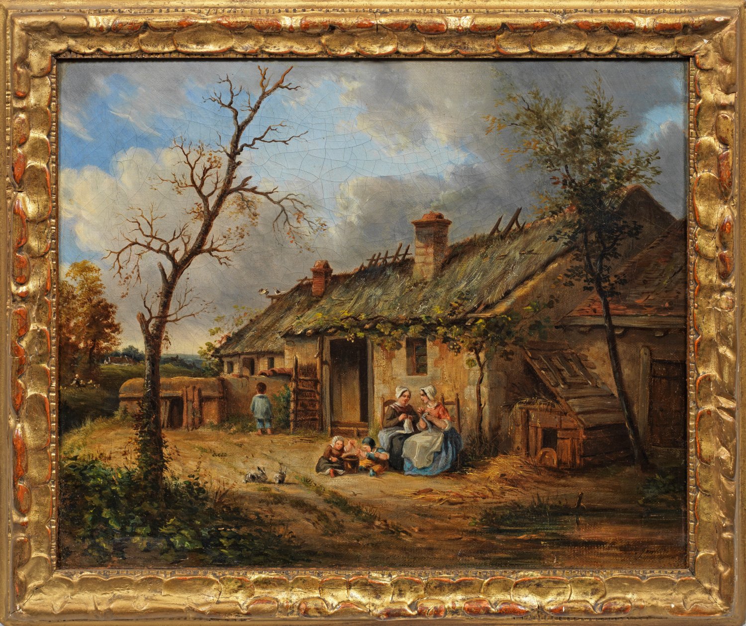 Vor bäuerlicher Hütte in spätsommerlicher Landschaft zwei Frauen im Gespräch und beim Handarbeiten, zu ihren Füßen zwei Kleinkinder in ihr Spiel vertieft, ein weiterer Knabe im Hintergrund, dem Betrachter den Rücken zuwendend. Subtil und liebevoll inszenierte Genreszene in heiterer Stimmung. Öl/Lwd., doubliert. R. u. undeutlich sign.; Verso schwer leserlich bez. 33 cm x 41 cm. Rahmen.