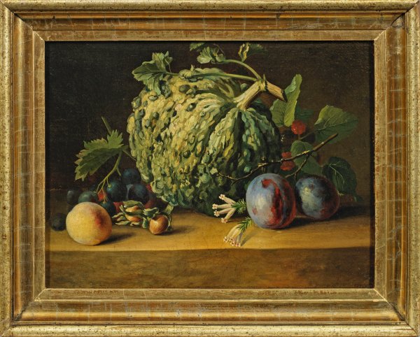 Stillleben mit Kürbis, Früchten, Nüssen und weißem Heidekraut