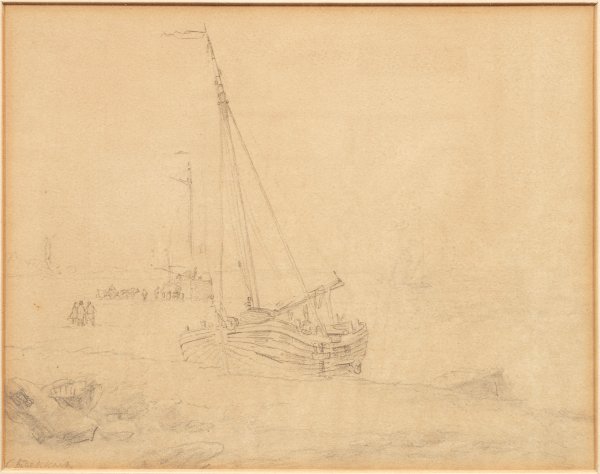 Fein gezeichnete Landschaft, belebt im Vordergrund durch ein Segelboot am Ufer und eines im Hintergrund, das gerade beladen wird. Der an der Amsterdamer Kunstakademie ausgebildete Maler ging 1834 nach Kleve, wo er 1841 eine eigene Akademie gründete, aus der die Klever Romantik hervorgeht. Koekkoek wurde ab 1829 vielfach mit Auszeichnungen geehrt und gilt als einer der bedeutendsten und erfolgreichsten Landschaftsmaler des 19. Jhs. von internationalem Renommée. Bleistift/Papier. L. u. sign.; 23,5 cm x 28,5 cm (Passepartoutausschnitt).