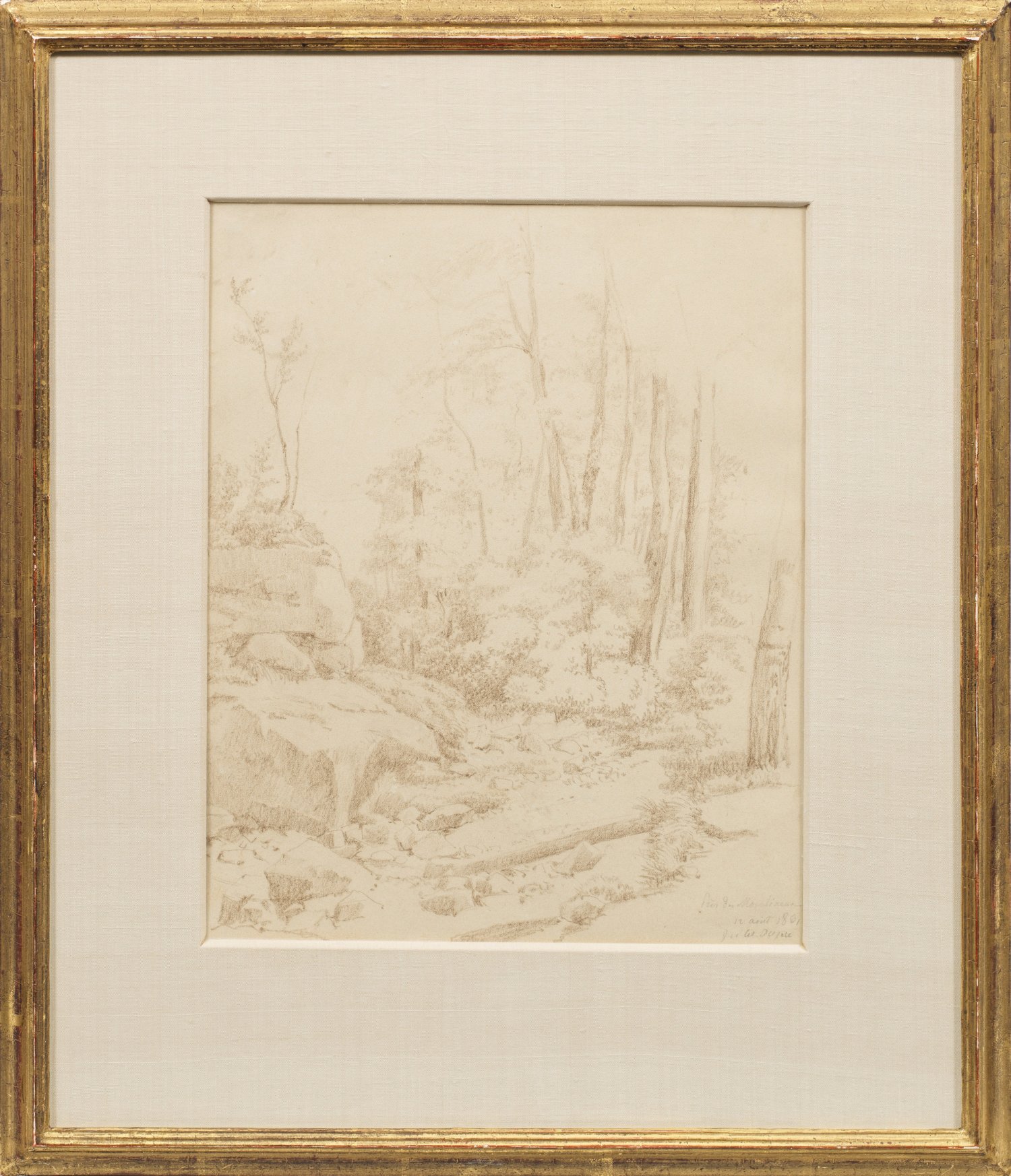 Mit zarten Strichen ausgeführtes Blatt Duprés, der zur Schule von Barbizon gehörte, als Hauptvertreter der sog. "Paysage intime" war er ein Begründer der modernen französischen Landschaftsmalerei. 1831 debütierte Dupré im Pariser Salon. Er malte meist französische Landschaften, 1835-1939 aber auch von John Constable beeinflusste englische Motive. Braune Kreide/Papier. R. u. sign., betitelt u. dat. "12 aout 1861". 27,5 cm x 22,5 cm (Passepartoutausschnitt). Rahmen.