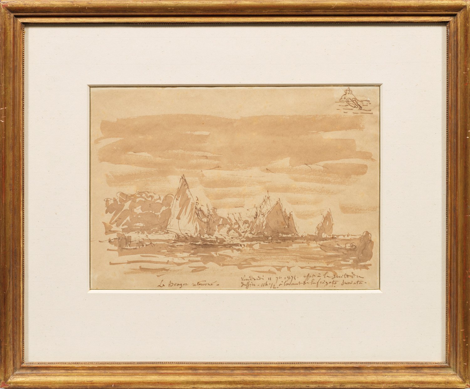 Fischerboote in der Lagune von Venedig, in der rechten oberen Ecke kleine Studie eines Fischers. Ziem gehörte zur Schule von Barbizon, debütierte 1849 auf dem Salon in Paris und gehörte danach zu den regelmäßigen Ausstellern. 1860 ließ sich Ziem im Künstlerviertel Montmartre nieder. Lieblingsmotiv Ziems war Venedig, wohin er 1841-1892 alljährlich reiste. Lavierte Sepiazeichnung/Papier. Unterhalb sign. bez. u. dat. 1874(?). Gebräunt. 19,8 cm x 28,2 cm (Passepartoutausschnitt). Rahmen.