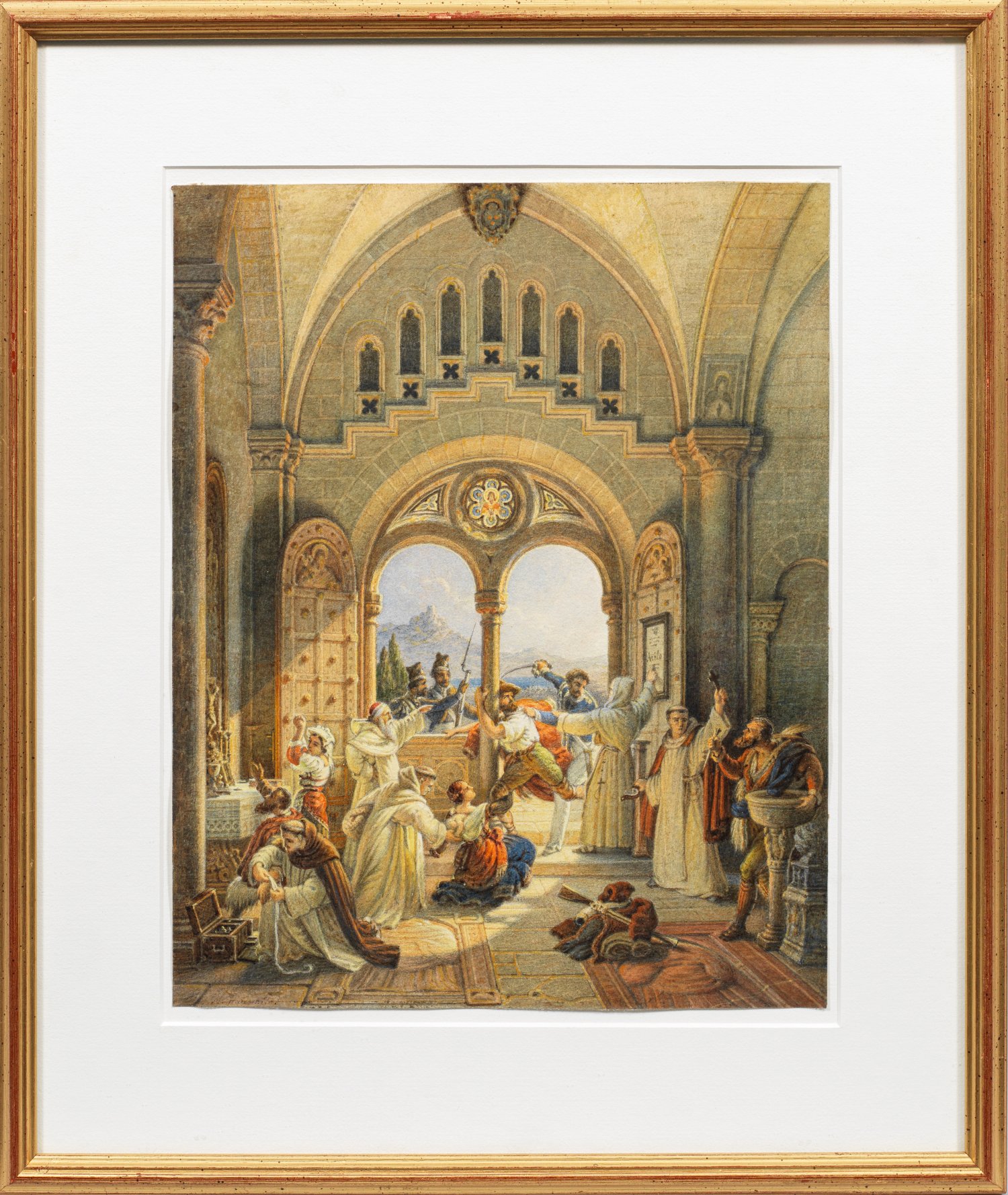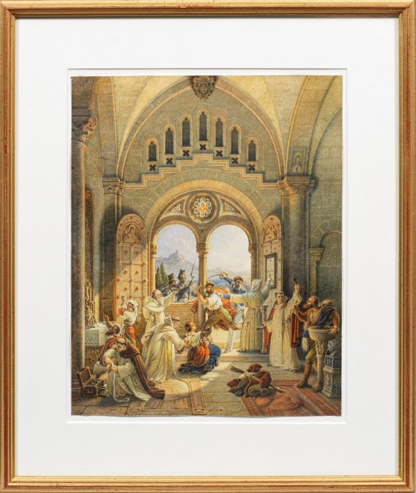 Vielfigurige, feinmalerisch ausgeführte Szene aus der italienischen Geschichte. Durch sein Motiv seltenes Blatt des vornehmlich als Architekturmaler tätigen Künstlers, der selbst an Dresdner Kunstakademie zum Architekten ausgebildet wurde. Seit 1833 hielt er sich länger in Rom auf, seit 1852 abwechselnd in Dresden und Italien, zuletzt dauerhaft in Neapel. Meist malte Hauschild italienische Dome, Kirchen und Klöster. Aquarell/Papier. Sign.; 29 cm x 23,5 cm. Rahmen.