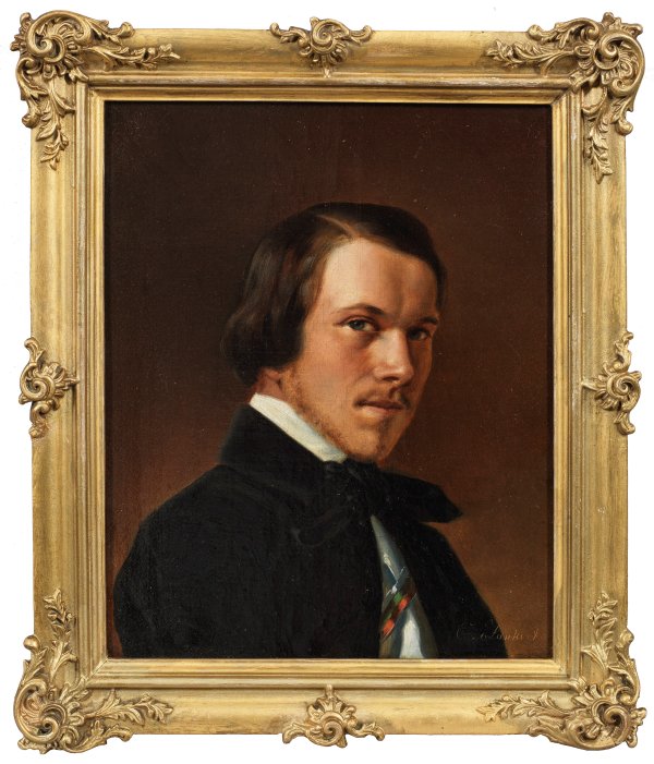 Feinmalerische, detailgetreue Darstellung des jungen Baron von Warkotsch in zeittypischer Kleidung und einer Scherpe über der Brust. Öl/Lwd.; R. u. sign.; Verso schwer leserlich bez. "Baron von Warkotsch Freund der Familie Sass (...)". 26,5 cm x 21,2 cm. Rahmen.