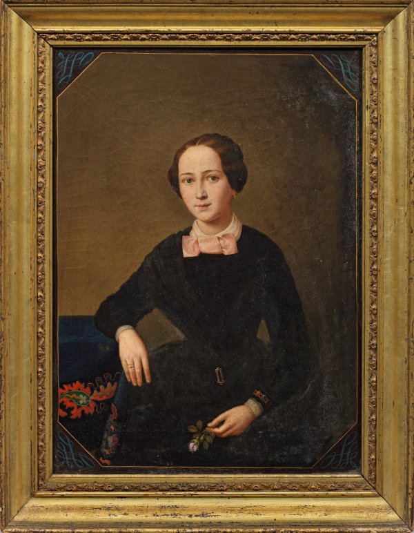 Vor neutralem Hintergrund eine junge Dame in zeittypischer Bekleidung mit zartrosa farbener Kragenschleife sitzend, einen kleinen Rosenzweig in der linken Hand haltend. Feinflüssig gemaltes, subtil charakterisierendes und stiltypisches Bildnis der Biedermeierzeit. Öl/Lwd.; 51 cm x 38 cm. Rahmen.
