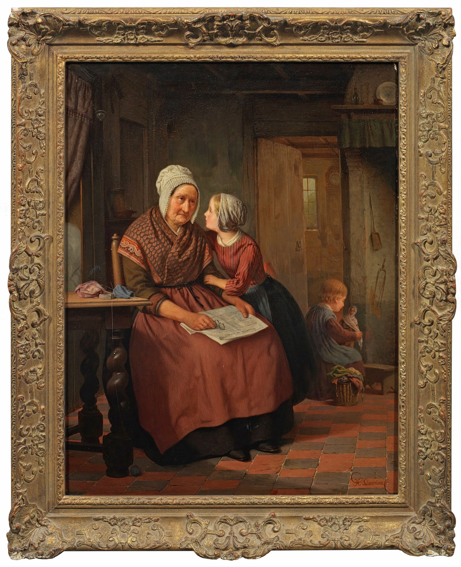 Liebevoll nimmt die Enkelin ihre, in ihre Zeitungslektüre vertiefte Großmutter zur Seite, um ihr etwas vertraulich ins Ohr zu flüstern. Im Hintergrund die kleine Schwester in ihr Puppenspiel vertieft. Einfühlsam beobachtete, feinmalerische Genreszene, gemalt in meisterhafter Detailtreue und Stofflichkeit. Öl/Holz. R. u. schwer leserlich sign. "CH Dauriac". 65,8 cm x 51,1 cm. Rahmen.
