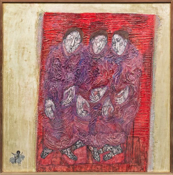 1969 entstandene, expressive Komposition mit drei Figuren auf teppichartigem Grund, in der linken unteren Ecke eine kleine Figur von Christus auf dem Palmesel. Edelmann studierte 1948-1952 an der Landeskunstschule Hamburg bei Erwin Krubeck, Willem Grimm, Ivo Hauptmann und Werner Haftmann. Seit 1952 freischaffend in Ralhstedt, erhielt Edelmann ab 1962 zahlreiche Aufträge für Kirchenfenster und Bronzen in Hamburger Kirchen. Öl/Lwd.; Verso sign., betitelt u. dat. 1969. 80 cm x 80 cm. Rahmen.