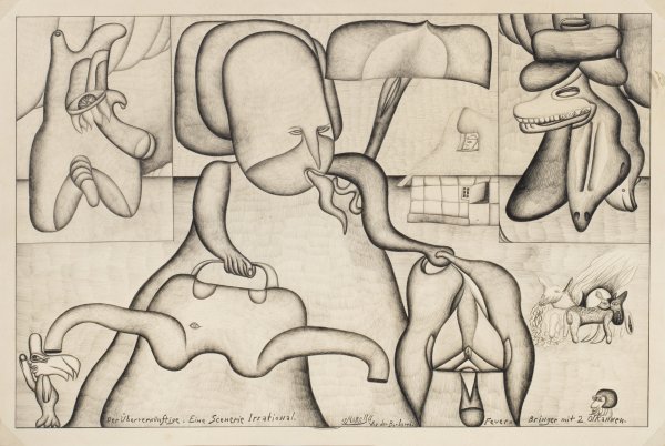 Für Morell typisches Blatt des Phantastischen Realismus, im Hintergrund ein Worpsweder Bauernhaus. Bleistift/Papier. Unterhalb sign., dat. 1966 u. betitelt. 33,7 cm x 50 cm. Rahmen.