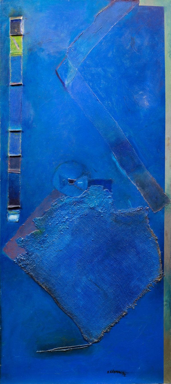 Großformatige Abstraktion in Blau mit grün-gelben Akzenten. Teilw. collagierte Mischtechnik und Öl/Lwd.; R. u. sign. und dat. (19)94. Verso betitelt, dat. und Werkinformationen. Ca. 160 cm x 73 cm.