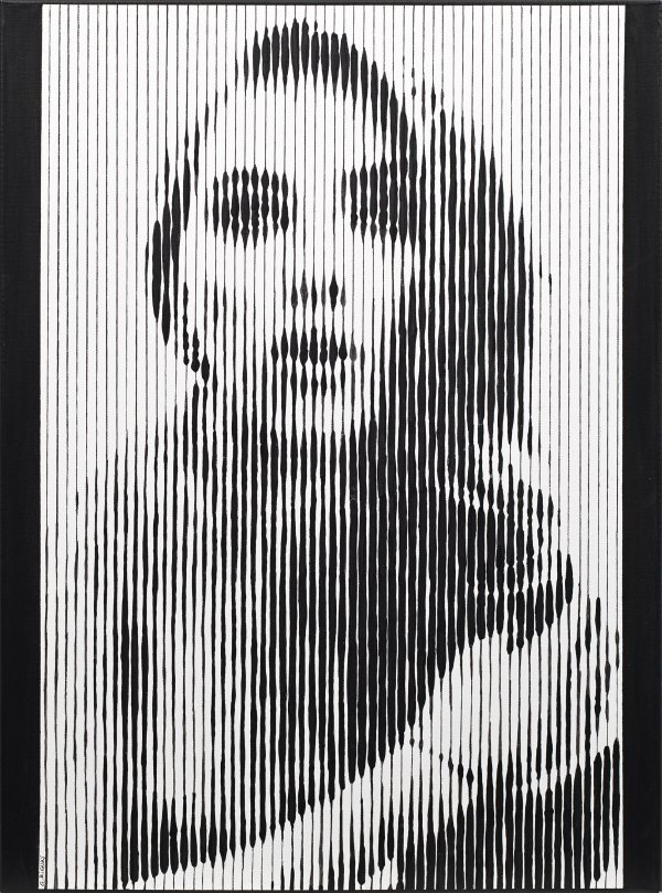 In schwarz-weißen, verfremdenden Linienstreifen ausgeführtes Gemälde des zeitgenössischen, niederländischen Pop Art-Künstlers, der vor allem Bildnisse berühmter Rock- und Filmstars sowie Models malt. Acryl/Lwd.; L. u. sign. 80 cm x 60 cm.