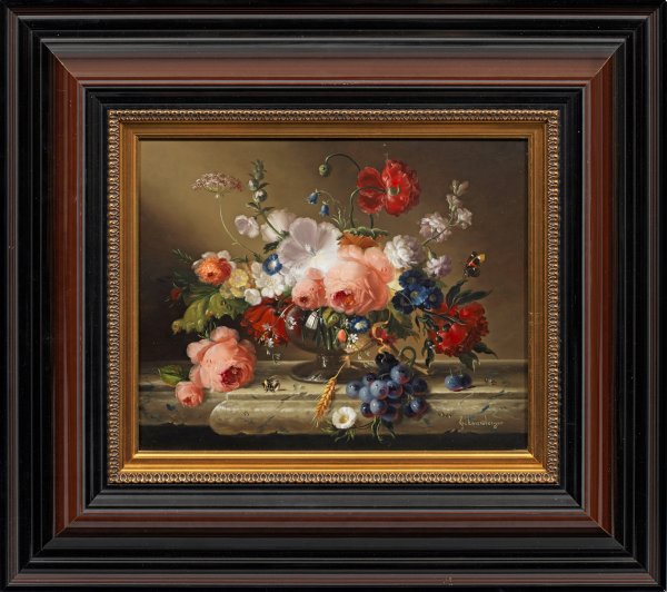 In fein lasierender Malweise ausgeführtes, motiv- und stiltypisches Werk Schwammbergers. Die Künstlerin steht bewusst in der großen Tradition der niederländischen Schule des 17. Jhs.; Ihre Intention ist die möglichst naturgetreue Darstellung duftiger Blumen und Insekten, die sie mit virtuosen optischen Effekten verbindet. Öl/Holztafel. R. u. sign. mit Violinschlüssel. 23,7 cm x 29,8 cm. Rahmen.