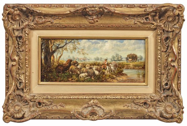 Flöte spielender Hirtenknabe mit Schafherde