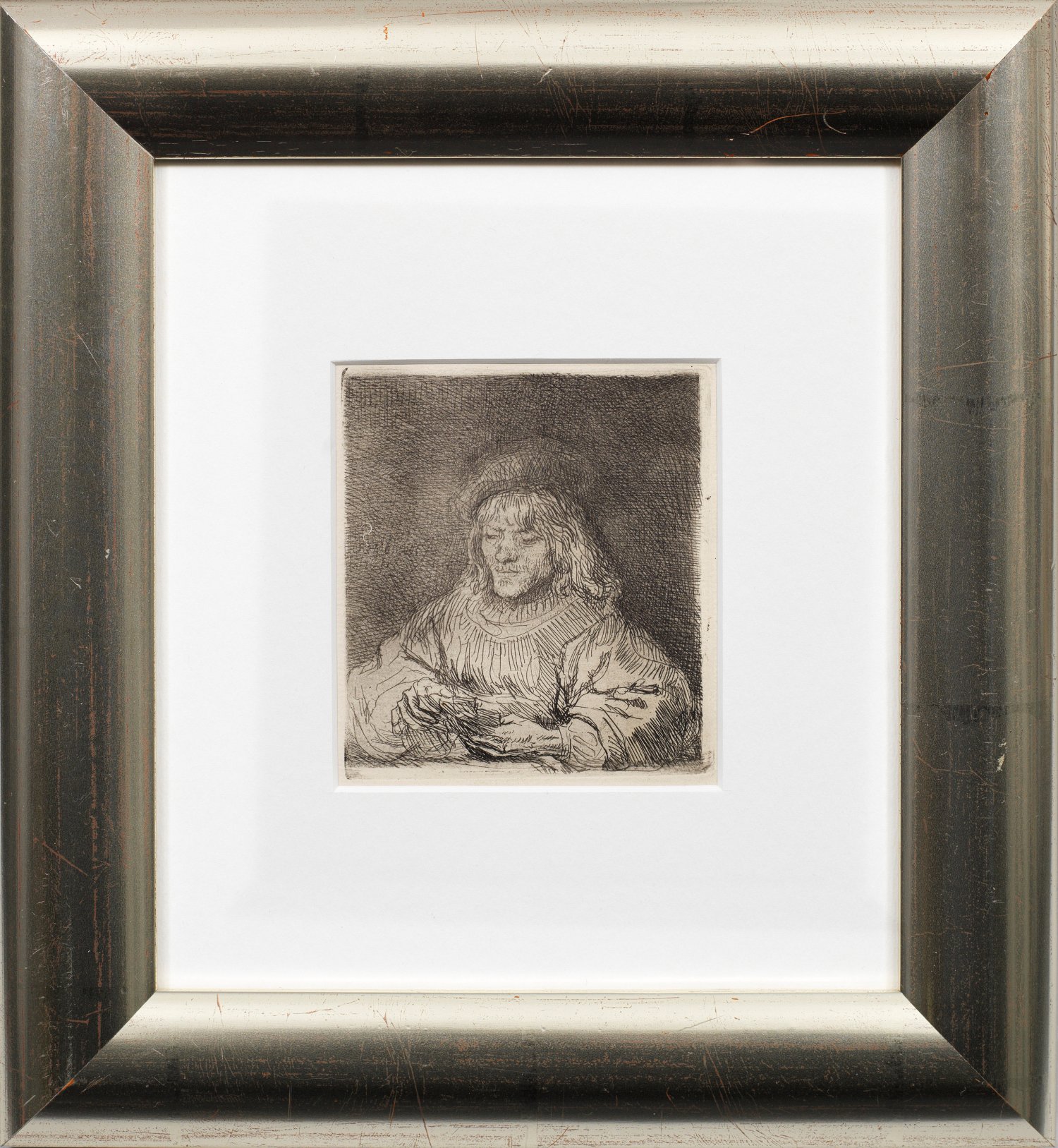 Radierung/Bütten, kaschiert auf Japan, 1641. In der Platte sign. und dat. 1641. Wvz. Bartsch 136, II. Beschnitten. Plattenmaß 9,2 cm x 8,3 cm. Blatt 10 cm x 9,3 cm. Rahmen.