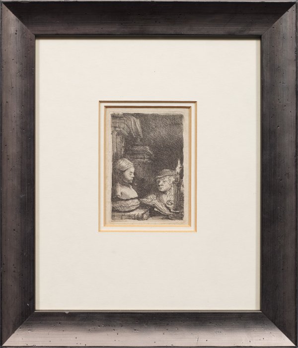 Radierung/Bütten, um 1641. Verso handschriftliche Bez. mit Dat. 1842 (wohl Sammlungshinweis). III. Zustand (nach Hollstein) mit den Überarbeitungen (nicht von Rembrandt) u. a. auf der Stirn der Büste, der Wange des Malers und der vormals weißen Stelle zwischen der Kerze und dem Buch. Hollstein B 130/III. Platte 9,6 cm x 6,5 cm. Blatt 12,6 cm x 9,5 cm. Rahmen.