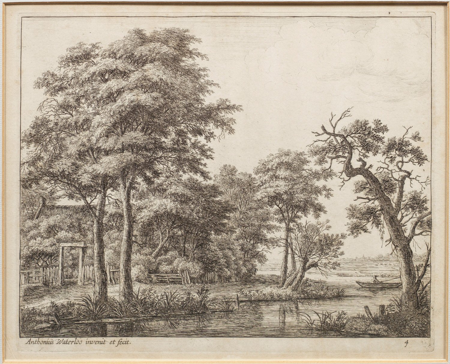 Radierung/Papier. In der Platte bez. "Anthonius Waterloo invenit et fecit / 4". Blatt 4 aus einer Serie von 6 Landschaften, Wvz. Hollstein Dutch L.251.113-118. Plattenmaß 23,5 cm x 29 cm. Rahmen.
