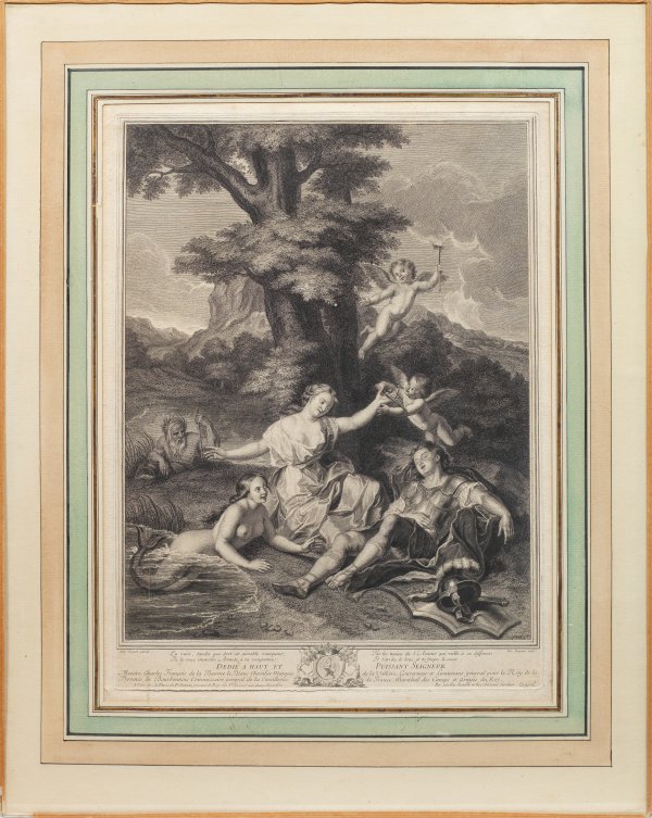 Kupferstich/Papier, 1707. Gestochen von Charles Dupuis (1685 - 1742), verlegt bei F. Chercau (Witwe) in Paris. Plattenmaß: 46,5 cm x 35 cm. Blatt ca. 51 cm x 37 cm. Rahmen.