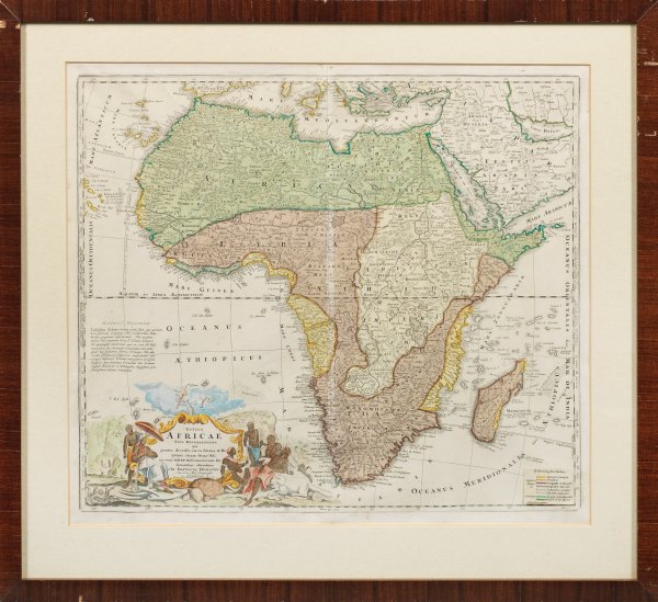Kolorierter Kupferstich von Johann Baptista Homann, Nürnberg um 1720. Gesamtansicht Afrikas mit angrenzenden Meeren. Figürlich dekorierte Titelkartusche. Farblegende ergänzt. Plattenmaß ca. 49 x 56,8 cm. Rahmen.