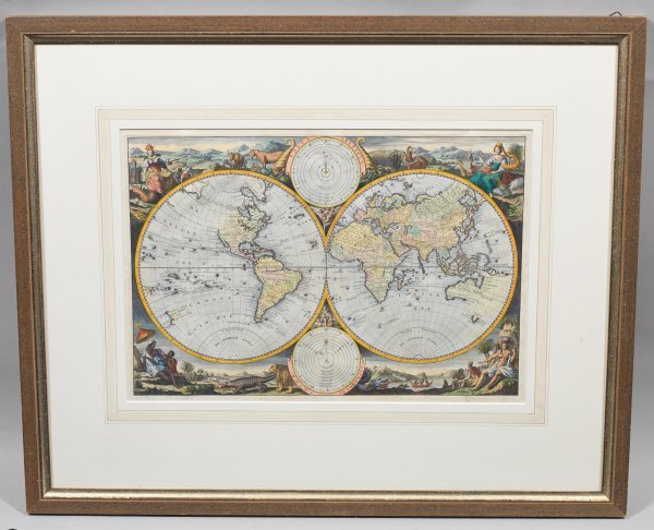 Altkolorieter Kupferstich/Bütten. Erschienen bei der Familie Keur, Amsterdam um 1740/1750. Doppelhemisphärische Weltkarte mit Darstellungen des ptolemäischen und kopernikanischen Sonnensystems sowie dekorativen Allegorien der vier Kontinente Amerika, Afrika, Europa und Asien. Die Karte ist angelehnt an die Weltkarte von Daniel Stoopendaal. Plattenmaß 30,5 cm x 45,5 cm. Rahmen.