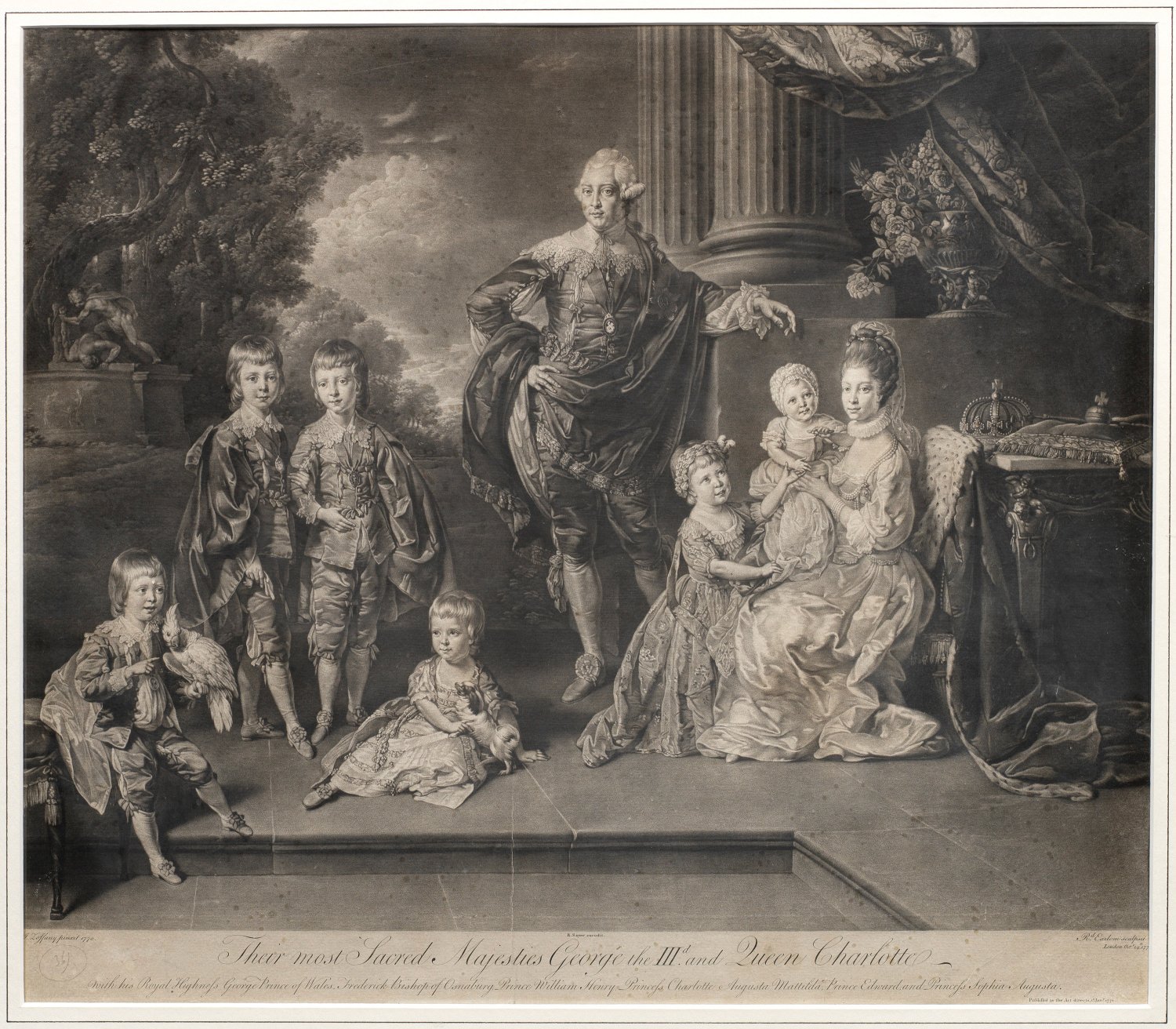 Mezzotinto/Papier, 1770. Gestochen von Richard Earlom (1743 - 1822), verlegt bei Robert Sayer, London 1771. Darstellung König Georg III. mit seiner Gemahlin Königin Charlotte und ihren sechs Kindern. 50 cm x 58 cm (Passepartoutausschnitt). Rahmen.