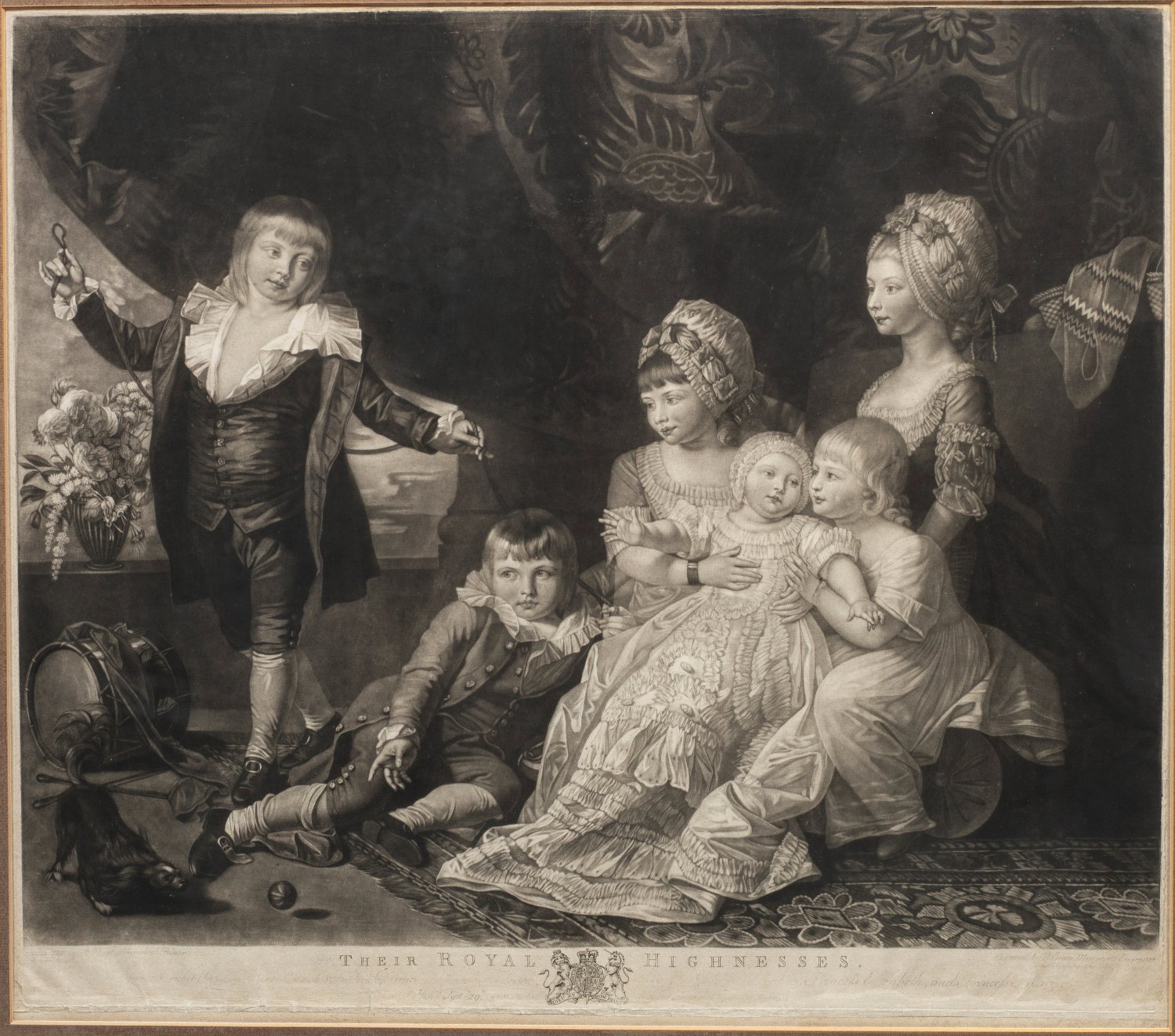 Mezzotinto/Papier, 1778. Gestochen von Valentine Green (1739 - 1813), erschienen bei John Boydell, London. Bildnis der sechs Kinder von Georg III. und seiner Gemahlin Charlotte von Mecklenburg-Strelitz. Plattenmaß 50,8 cm x 58,5 cm. Rahmen.