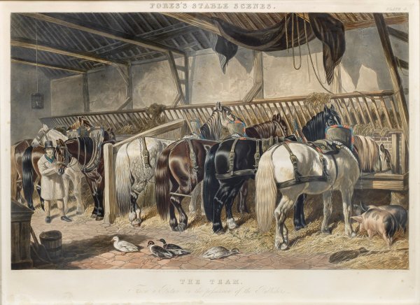 Hand-coloured aquatint from John Harris (1791 - 1873) after John Frederick Herring sen. (1795 - 1865), published by Fores, London 1846. Plate 4 from the series "Forest Stable Scenes".