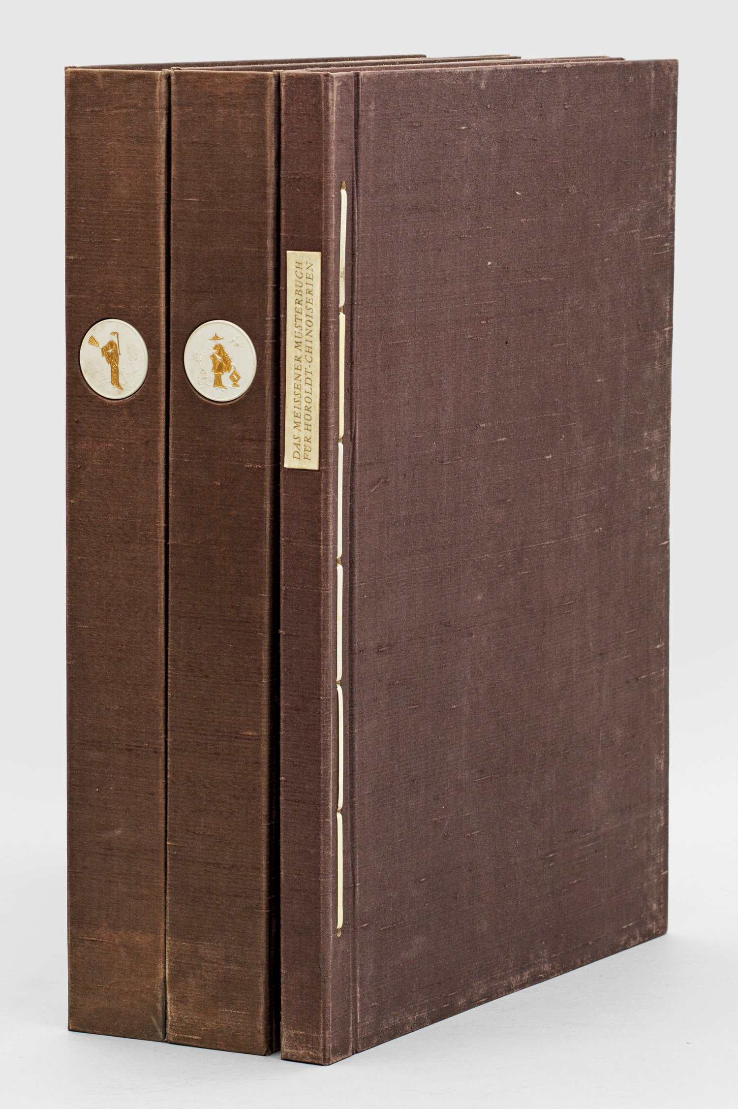 Edition Leipzig, 1978. Zwei dunkelbraune Honanseiden-Kassetten, auf dem Rücken mit eingelassener, goldstaffierter Porzellanplakette sowie Kommentarband von Rainer Behrends in Deutsch, Englisch, Französisch und Spanisch. Einmalige, limitierte Weltauflage von 1500 Exemplaren. Teilw. nummeriert "1272". Ausfaltbare sowie faksimilierte Tafeln mit über 180 Abb. der Meissner Musterblätter unter Seidenfähnchen. Die Originale werden im Museum des Kunsthandwerks Leipzig (Grassimuseum) verwahrt. Original-Schuber besch.; Nicht kollationiert. 36 cm x 50 cm.