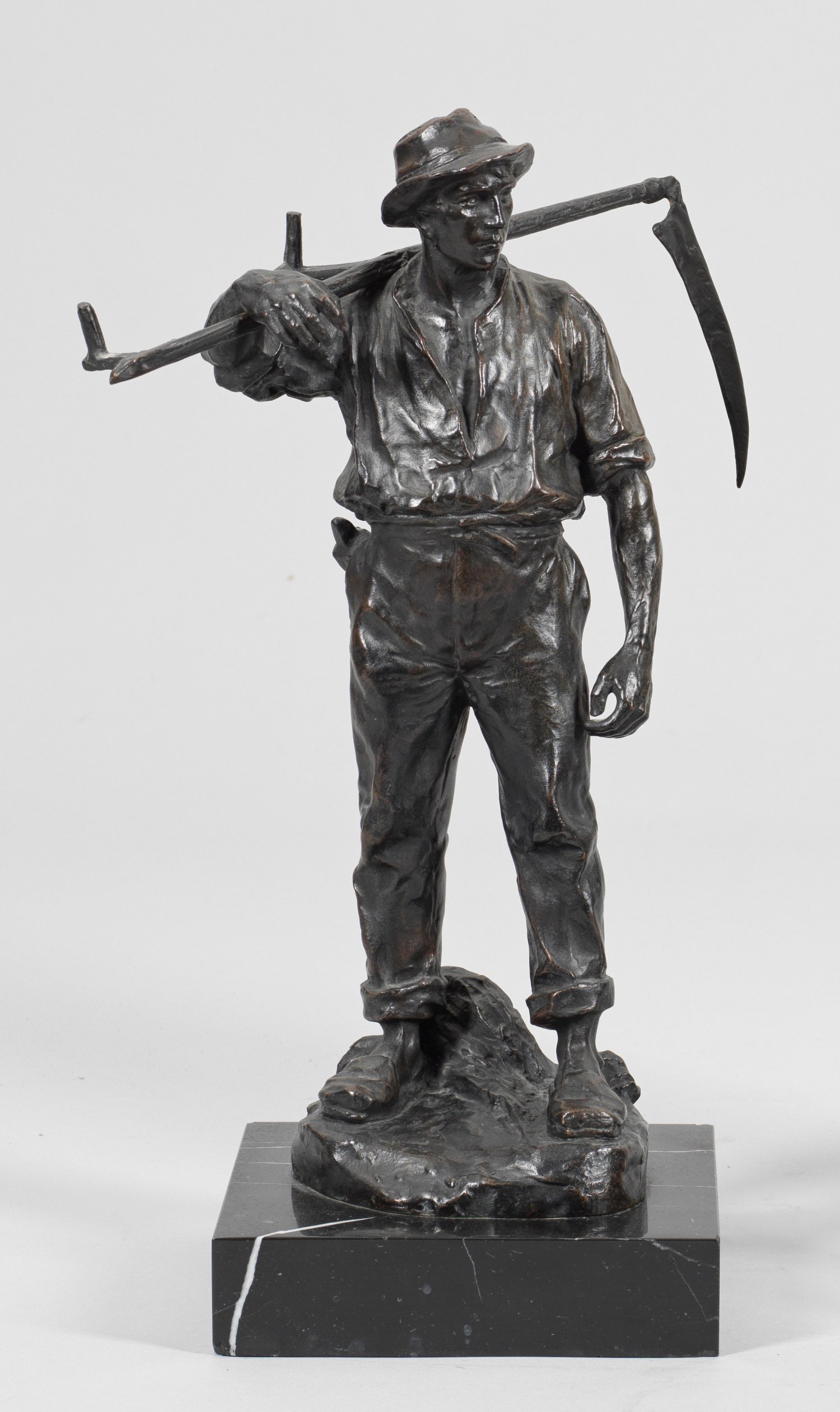 Bronze, dunkel patiniert. Schwarzer, weiß geäderter Marmorsockel. Realistische Figur des vielseitigen Bildhauers. Er erhielt seine Ausbildung an der renommierten Wiener Kunstgewerbeschule bei August Kühne und an der Wiener Akademie bei Edmund von Hellmer. Seit 1909 war Müller Mitglied der Wiener Künstlergenossenschaft. Ges.-H. 42,8 cm.