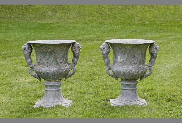 Bronze, grün patiniert. Über flacher, quadratischer Plinthe kraterförmiger, blattreliefierter Korpus mit weit ausschwingendem Lippenrand. Umlaufend der Wandung breiter Fries aus schlanken, gegeneinandergestellten Volutenmotiven. Seitliche Henkel aus vollplastisch gestalteten Hermenfiguren in Gestalt von Löwen. H. 70 cm.