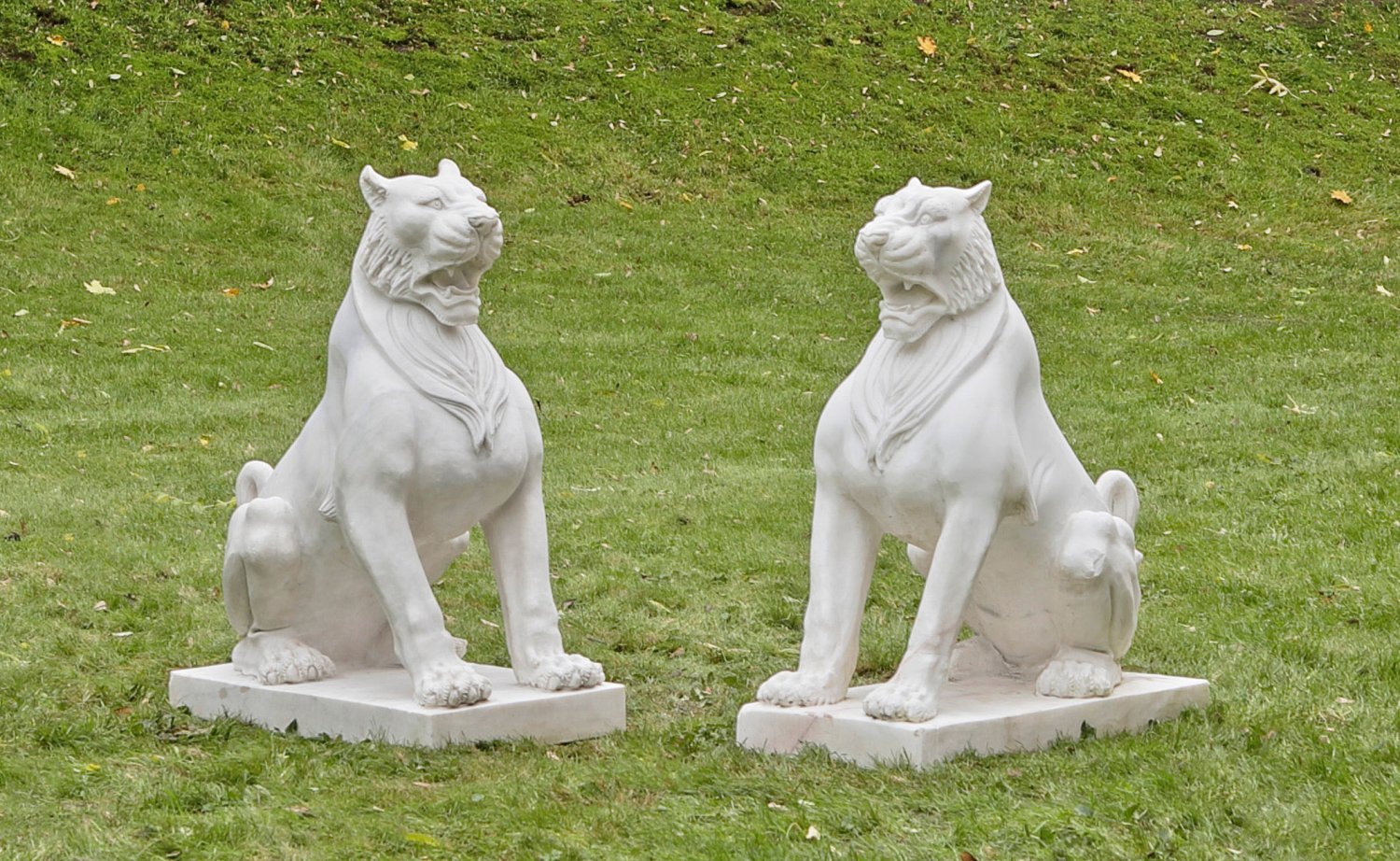 A pair of Italian white marble lions as garden sculptures. One plinth repaired.