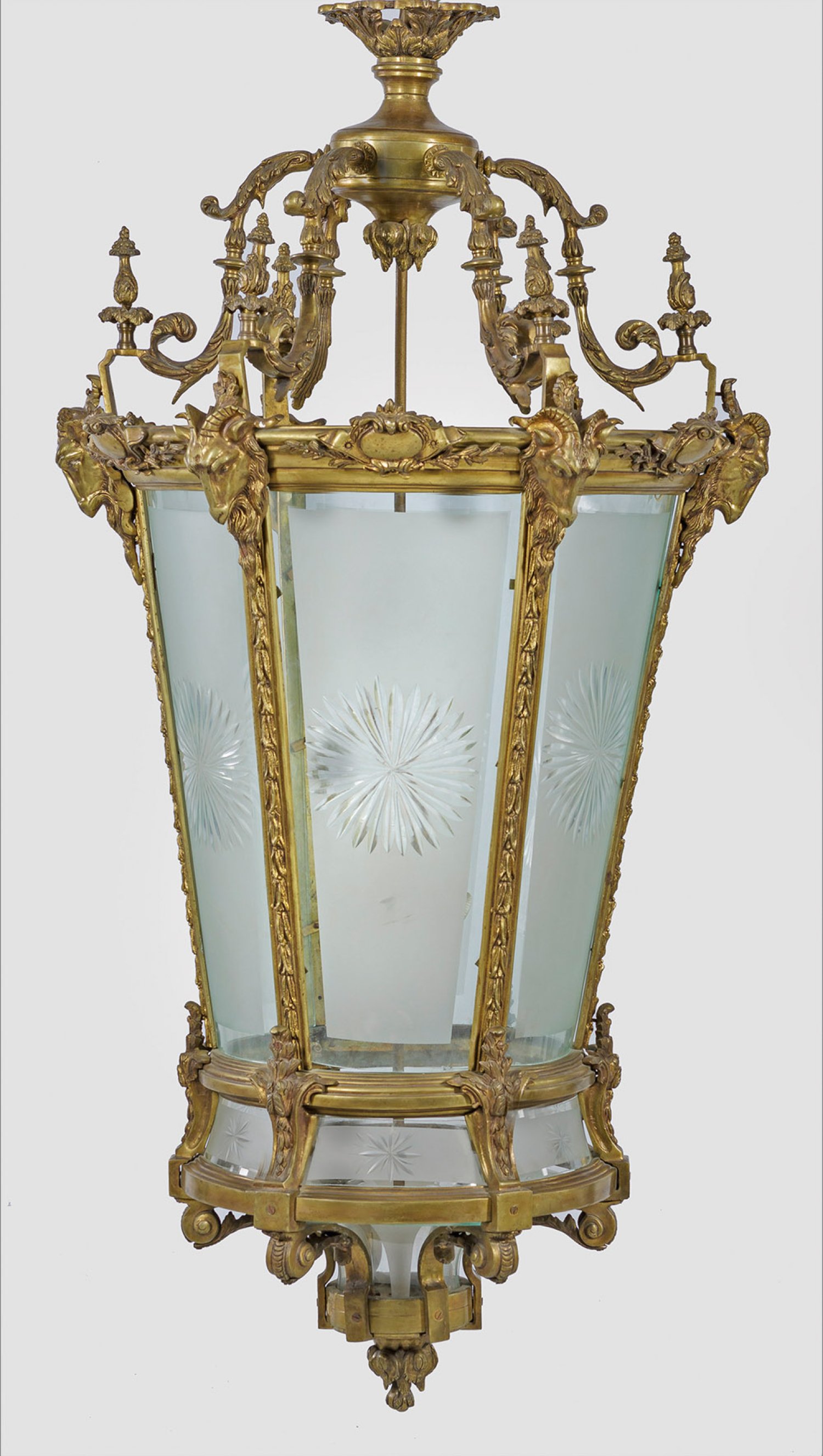 6-flg.; Bronze und farbloses, teilw. satiniertes Glas. Sich konisch weitender Korpus aus profilierten Streben mit vollplastisch gestalteten Widderköpfen sowie Glaseinsätzen mit großen Sternmotiven. Oberer Abschluss aus Voluten mit Balusterbekrönungen. In der Mitte schlanker Schaft als Träger für gestuft angeordnete Leuchtmittel. Elektrifiziert. H. 150 cm. D. 72 cm.
