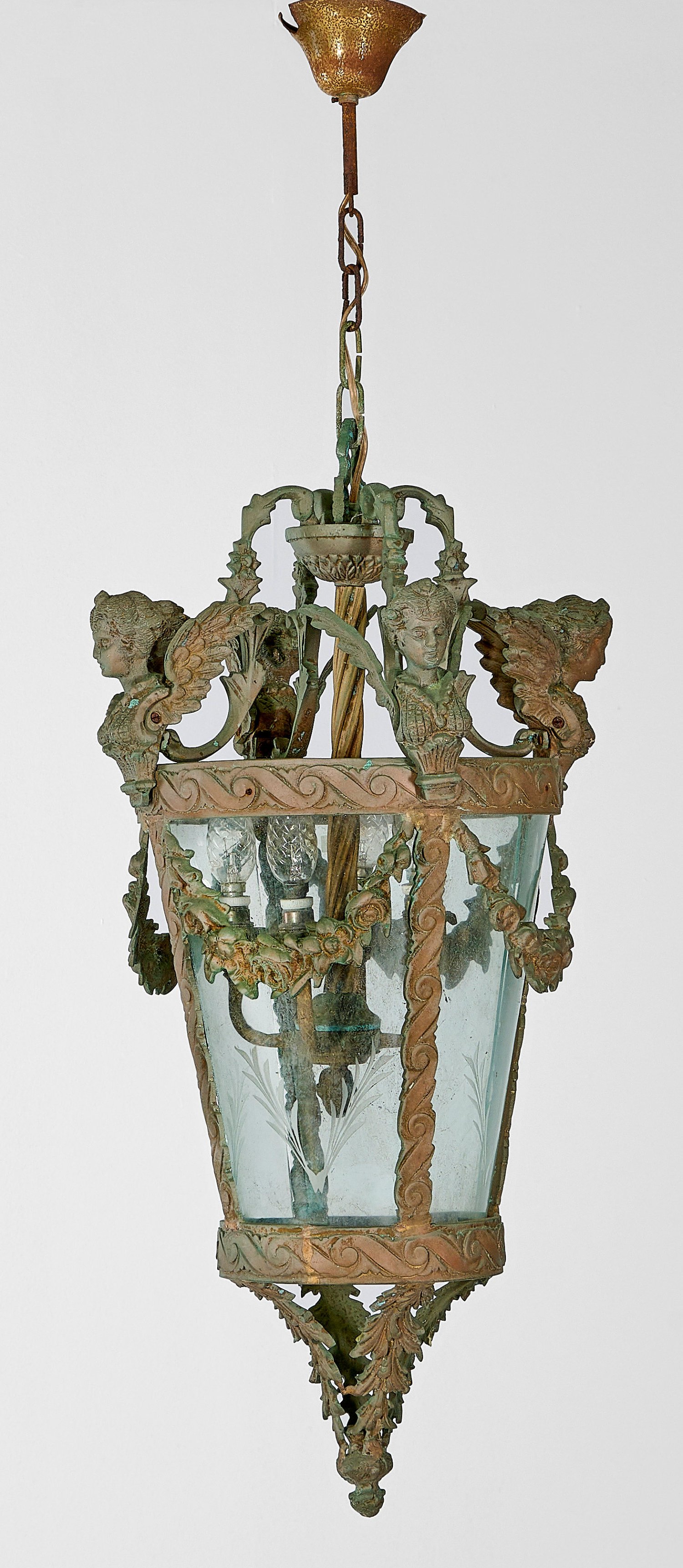 4-flg.; Bronze, patiniert. Sich konisch weitender Korpus aus flachen Streben mit Wellenband, umgeben von üppigen Festons. Oberhalb plastisch gearbeiteter Genien sowie stark geschwungene Volutenmotive als oberer Abschluss. Gedrehter Schaft als Träger für Leuchtmittel. Elektrifiziert. H. 75 cm. D. 35 cm.