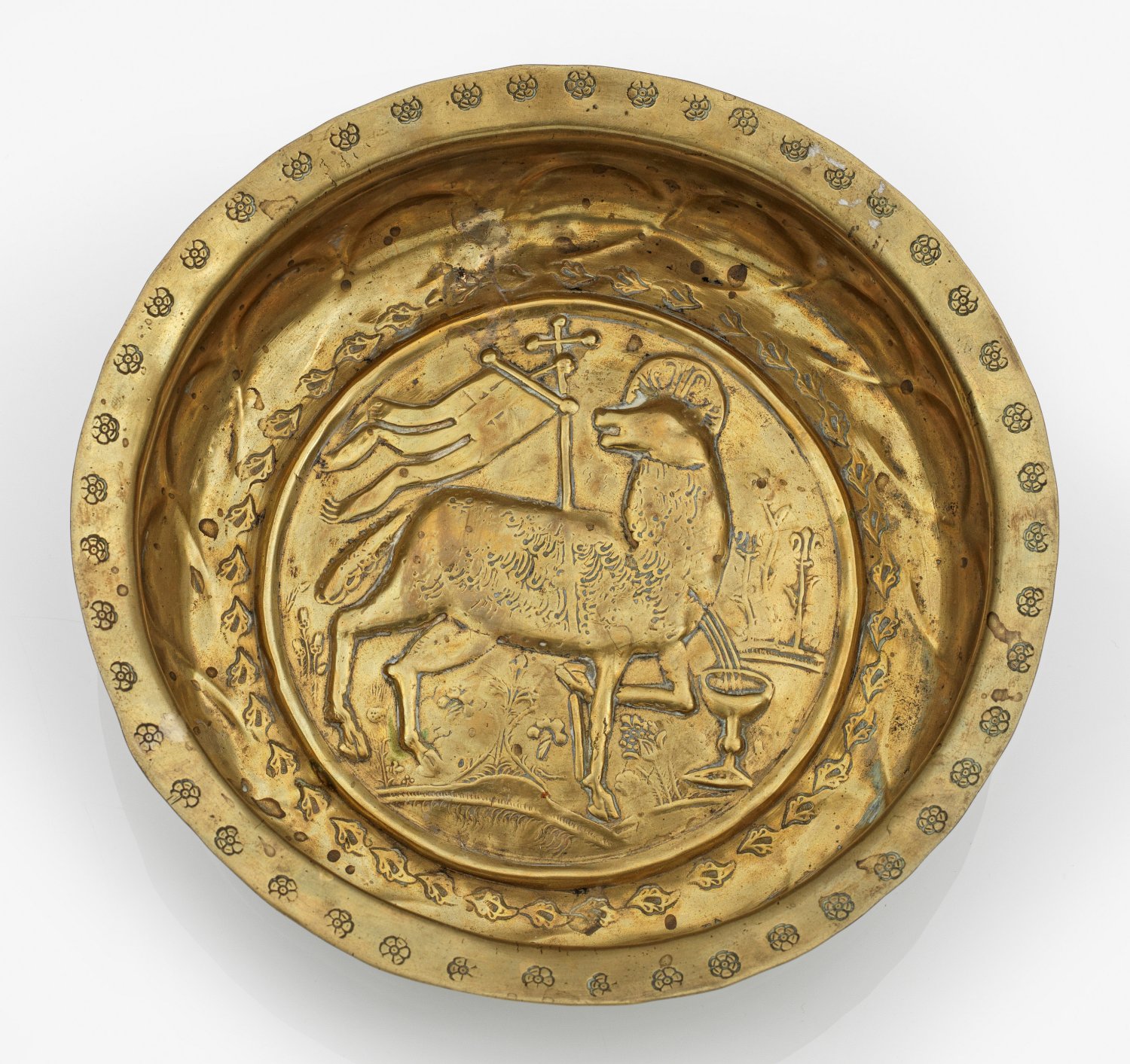 Messing. Tief gemuldete Schale mit schmalem, ausgestelltem Rand. Zentral im gewölbtem Spiegel ein rundes Medaillon mit reliefplastisch dargestelltem Lamm Gottes nach rechts, der Heilsfahne und Kelch. Der Rand verziert mit stilisiertem Blatt- und Blütendekor. H. 5,5 cm. D. 22,5 cm.