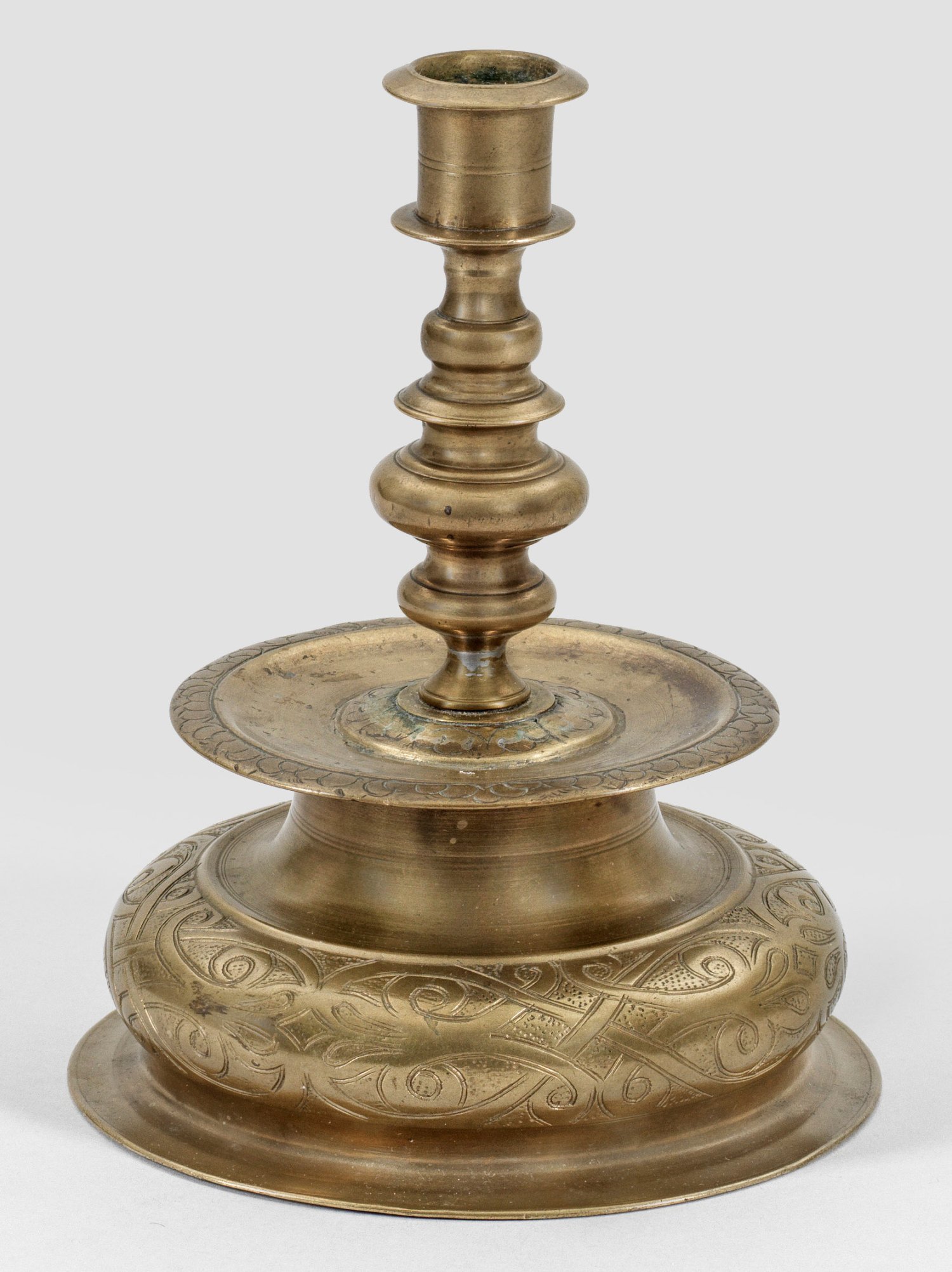 Messing, gegossen und dünn abgedreht. Hoher, mit einer kräftigen Auswölbung nach unten abfallender, oben durch einen breiten Teller abgeschlossener Rundsockel. Darüber vielfach gegliederter Balusterschaft mit zylindrischer Tülle. Leuchterkorpus umzogen von zarten Profillinien. Der Sockel ornamental graviert über punziertem Grund. H. 17 cm. Stand-D. 13 cm.