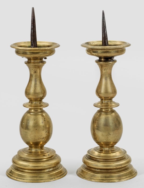 Bronze. Formschöne, schwere Leuchter mit mehrfach profiliertem, breitem und aufgewölbtem Rundfuß. Balusterschaft mit einer sehr kräftigen Kugel. Gemuldete Traufschale mit montierter, eiserner Platte mit hoch aufsteigendem Dorn. Leuchterkorpus von zarten Profillinien umzogen. H. 44 cm.