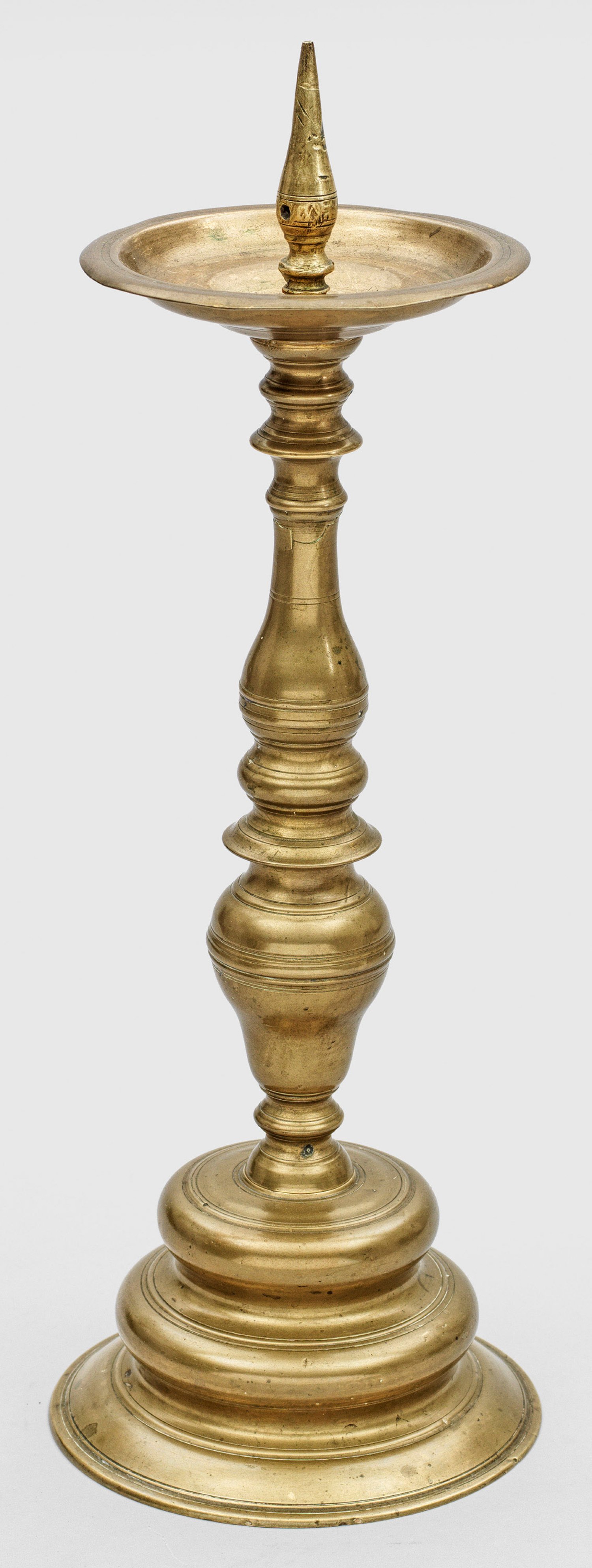 Messing. Hoher Rundfuß mit ausgestelltem Rand und zwei kräftigen Wellenprofilen. Vielgliedriger Schaft mit profilierten Nodi, einem umgedreht birnförmigen und einem langen Balusterglied in profilierter Tropfschale mit balusterförmigem Dorn endend. Auf dem Fußrand gem., Meister Melchior Schuster (wird Meister 1654). H. 42,5 cm. Stand-D. 15 cm.