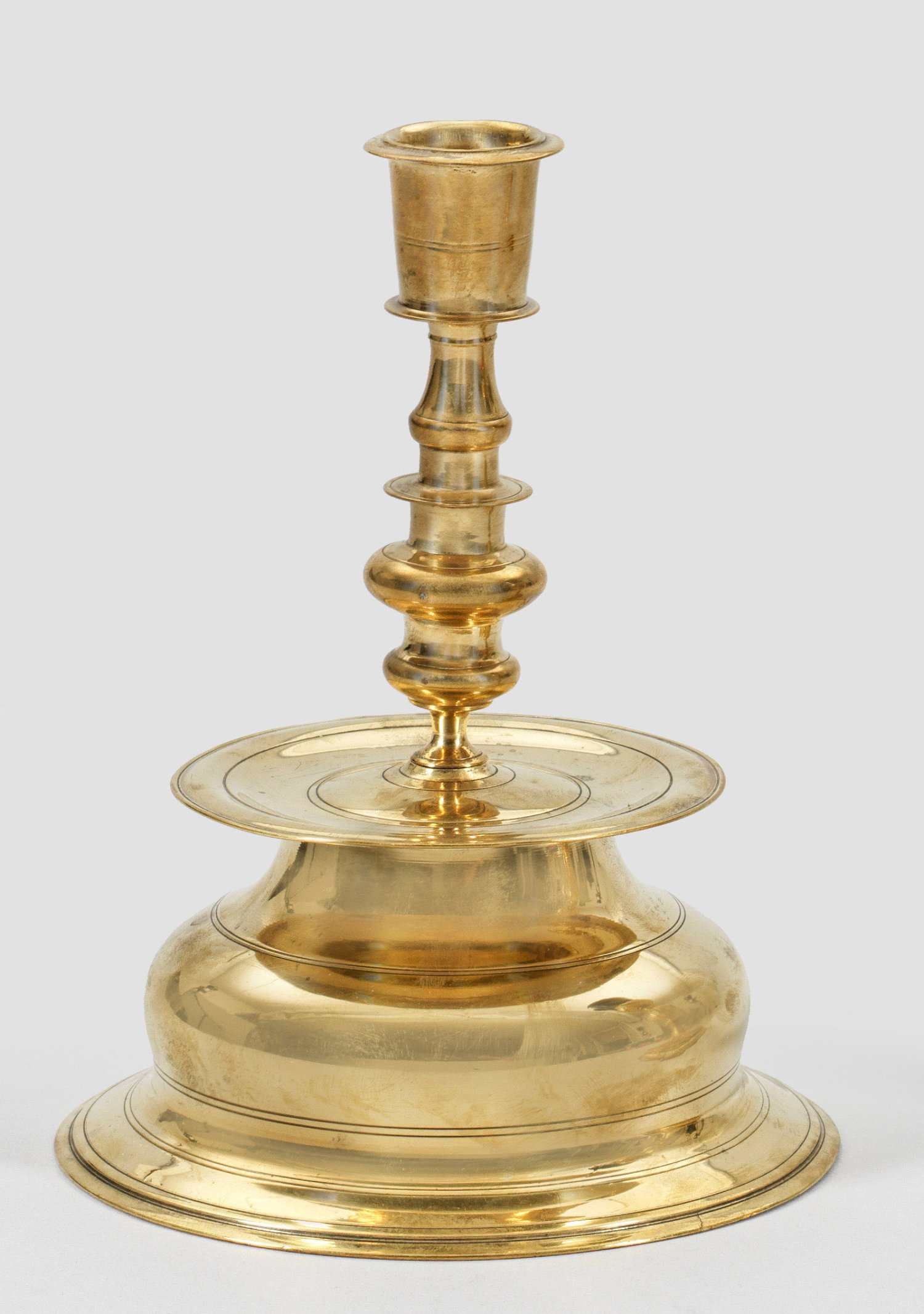 Messing, gegossen und sehr dünn abgedreht. Hoher, mit einer kräftigen Auswölbung nach unten abfallender, oben durch einen breiten Teller abgeschlossener Rundsockel. Darüber vielfach gegliederter Balusterschaft mit zylindrischer Tülle. Leuchterkorpus umzogen von zarten Profilringen. H. 20 cm. Stand-D. 15,3 cm.