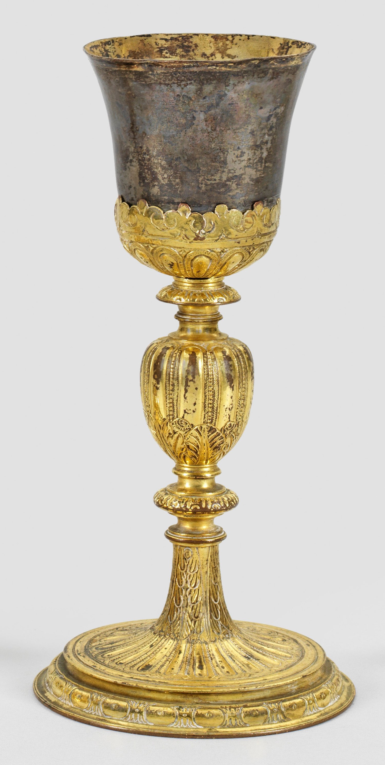 Kupfer, vergoldet und versilbert. Mehrfach profilierter Rundfuß, übergehend in zentral von großem, ovoiden Nodus gegliederten Balusterschaft. Flächendeckender Dekor aus reliefierten Zungen und Blattwerk. Auf dem Stand gravierte Ovalkartusche mit Darstellung einer Burg. Glockenförmig ausschwingende, glatte Kuppa. Innen vergoldet. H. 23,5 cm.