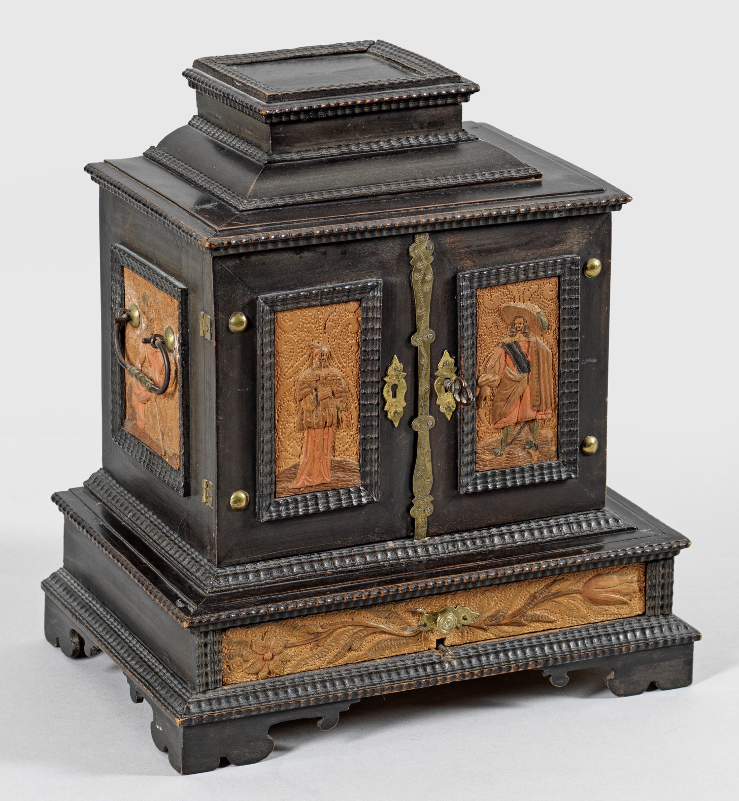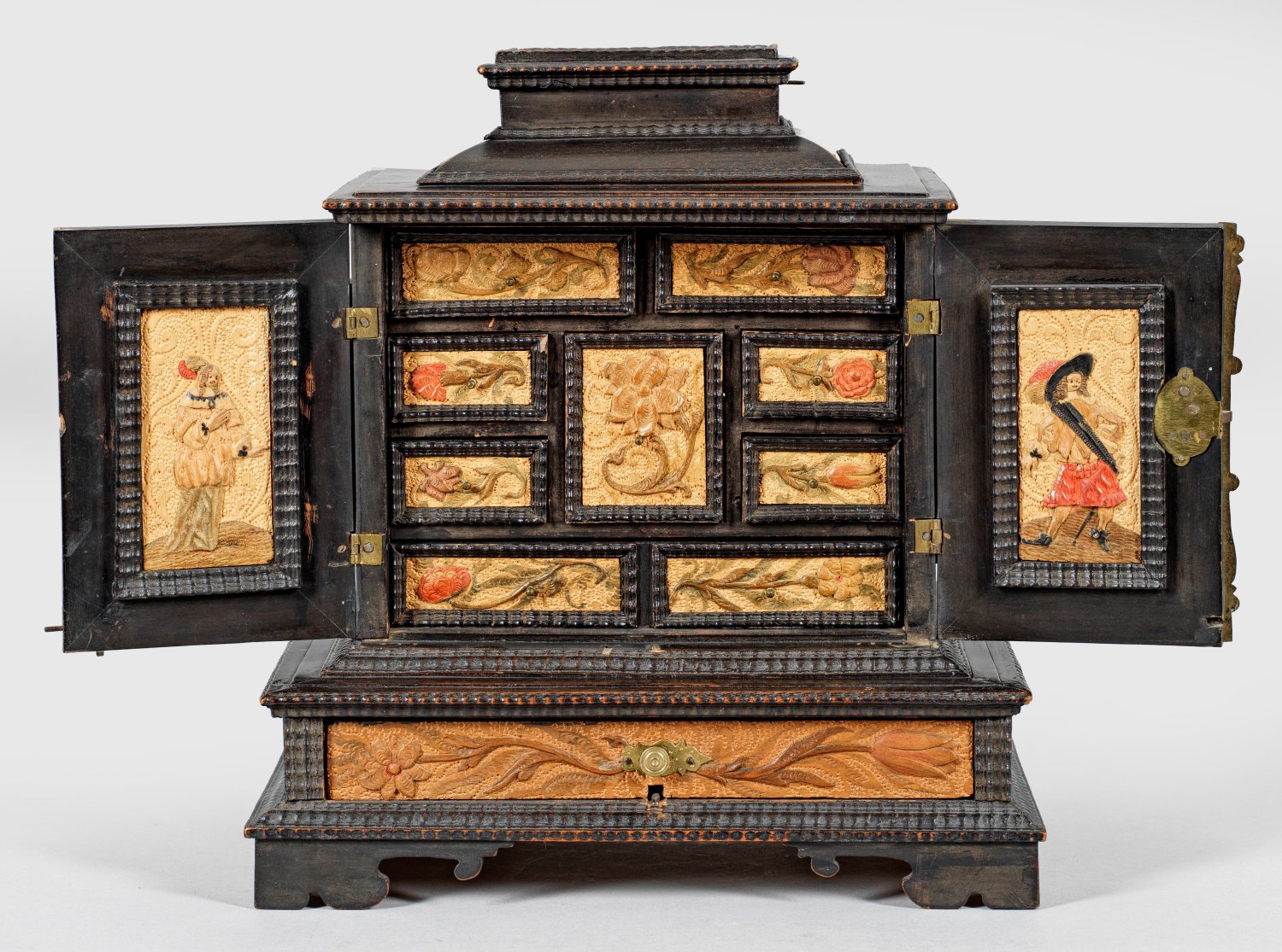 Holz, ebonisiert sowie Reliefintarsien aus unterschiedlichen, teilw. gefärbten Hölzern, wie Ahorn und Pappel. Über einschübigem Zargensockel mit gesägten Füßen gerader, querrechteckig angelegter Korpus mit Profilen aus Flammleisten sowie podestförmigem oberen Abschluss mit verdeckter Lade. In der Front zwei Türen mit eingelassenen Darstellungen eines adligen Paares vor ornamentiertem Hintergrund. Seitlich und innen korrespondierende Darstellungen. Dahinter gestaffelte Facheinteilung aus diversen Schubladen unterschiedlicher Größe mit Reliefintarsien aus Blütenmotiven. Auskleidung mit marmoriertem, sog. "Türkischpapier". H. 28,5 cm. 27 cm x 17,5 cm.