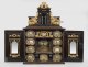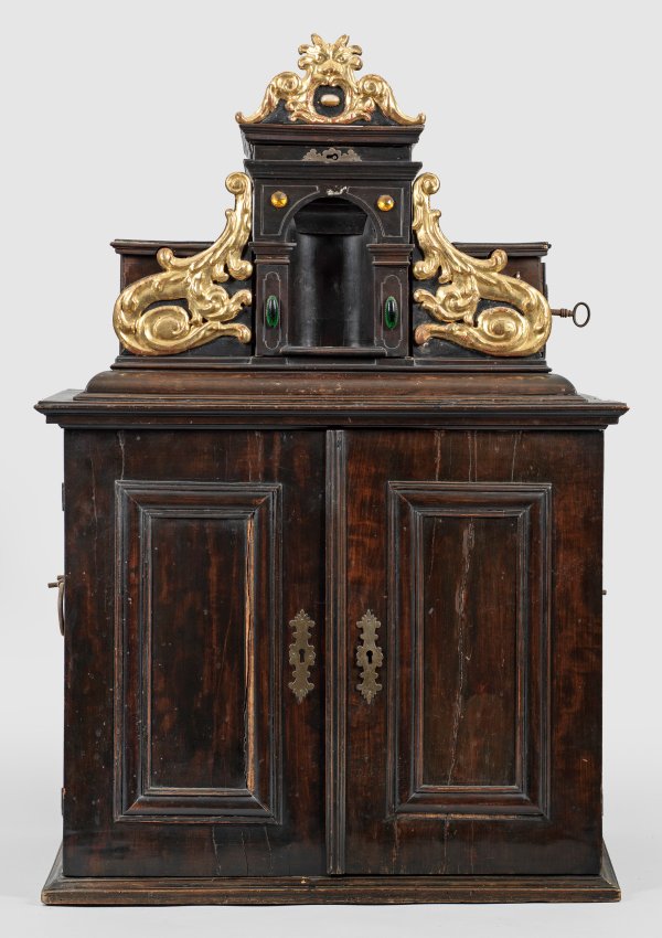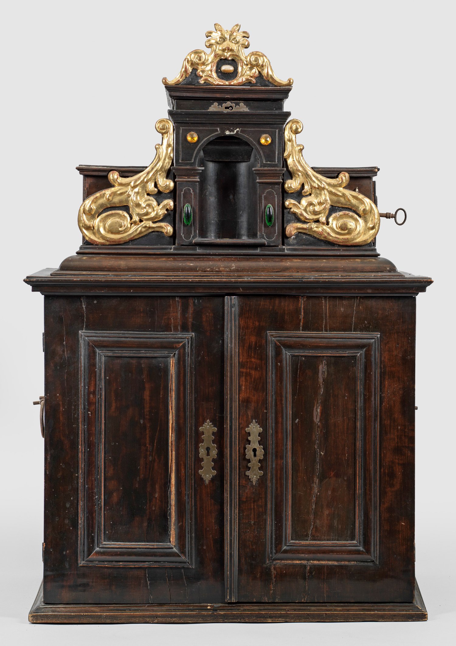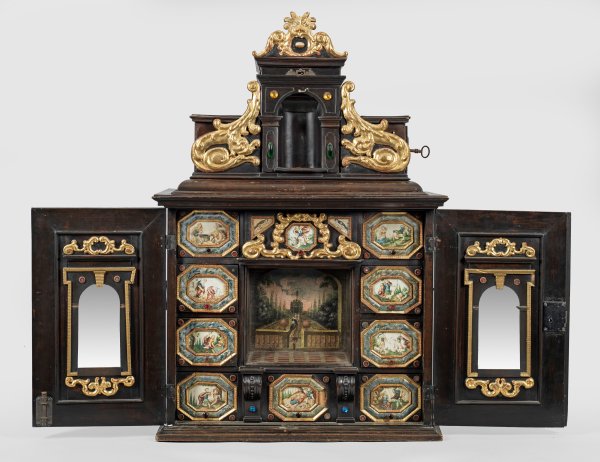 Nussbaum, furniert und dunkel gebeizt sowie Holz, geschnitzt, polychrom gefasst und teilw. vergoldet. Gerader, hochrechteckiger Korpus mit profilierten Füllungen auf schmaler Profilzarge. In der gegliederten Front zwei Türen. Dahinter eingelassene Spiegelflächen sowie gestaffelte Facheinteilung aus zentralem, herausnehmbarem Mittelfach in Form eines stilisierten Gartenzimmers mit Aussicht in eine weite Parklandschaft sowie auf den Schubladen verglaste Reserven mit unterschiedlich gestalteten Szenerien aus der Mythologie mit Darstellungen u. a. von Diana, Narziss, Herkules, Apollo und Marsyas sowie Europa auf dem Stier. Oberhalb gestuft ansteigender Aufsatz mit seitlichen Schubfächern sowie zentralem Nischenmotiv, flankiert von Voluten. H. 80 cm. 54 cm x 36 cm.