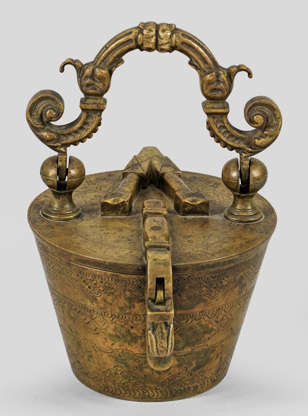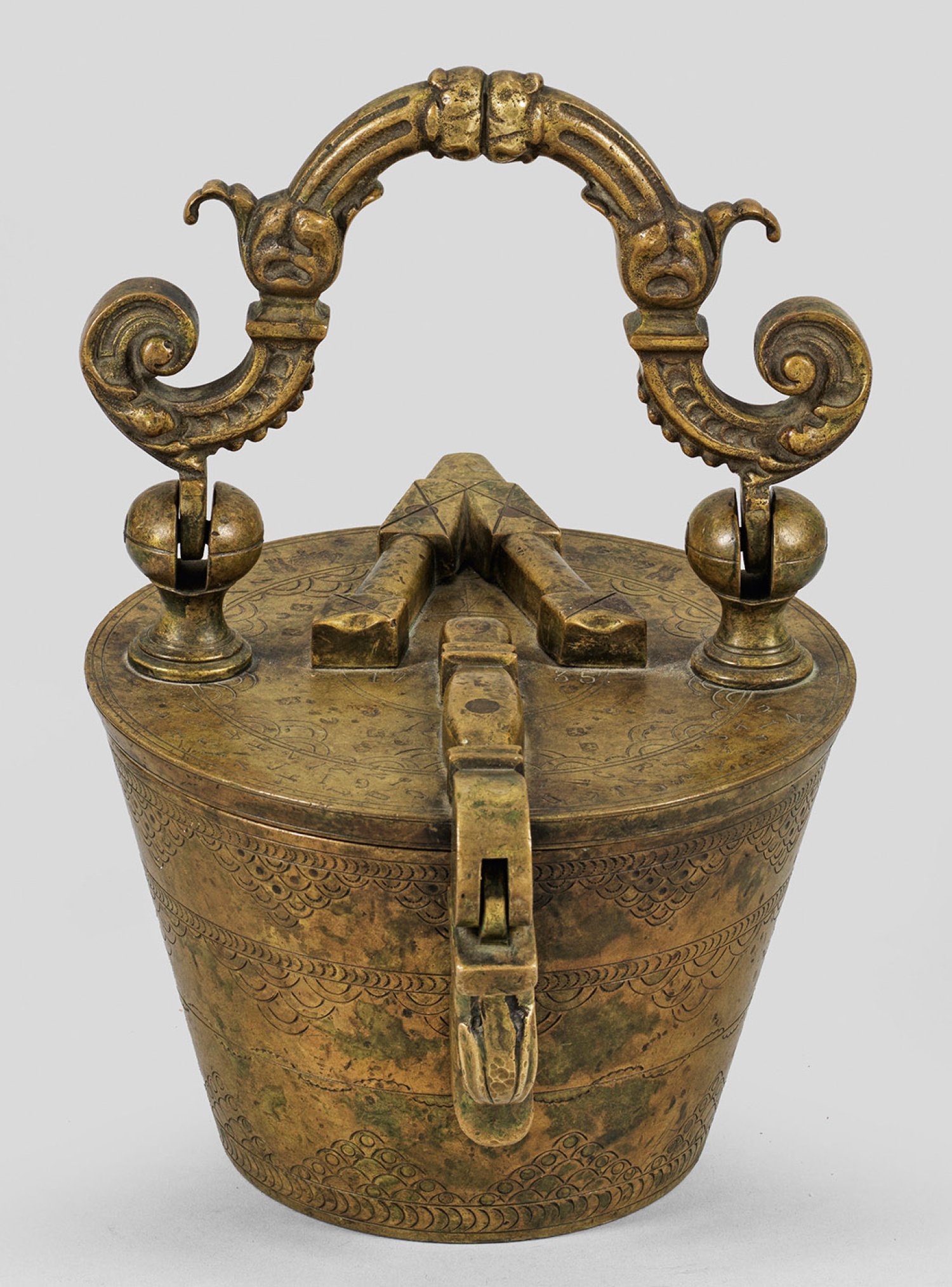 Bronze. Sich konisch erweiternder, glatter Korpus. Scharnierter Deckel mit beweglichem Bügelgriff aus reliefplastischen Voluten und Überfallriegel in Form eines Entenkopfes. Auf dem Deckel korrespondierender Dekor sowie am Rand verziert mit mehrfach punzierten Großbuchstaben. Dat. "1735". Die Wandung gegliedert durch schmale, gravierte Profilbänder und Ornamentfriese mit Schuppendekor. Im Inneren 14 Einsatzgewichte. Gem.; H. 26,5 cm.