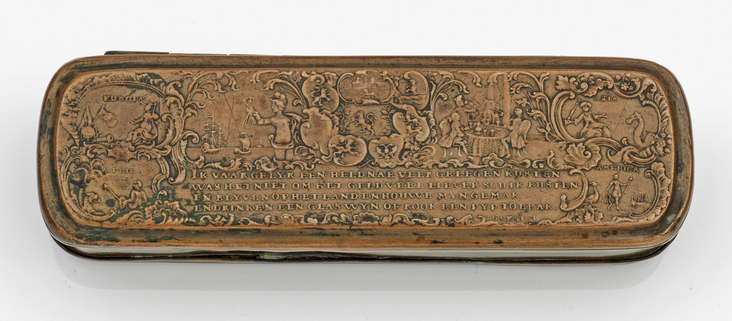 Messing und Kupfer, geprägter Reliefdekor. Auf dem scharnierten Deckel Allegorien der Kontinente Asien, Amerika, Afrika und Europa mit holländischer Inschrift, den Handel und die Seefahrt preisend. Rückseitig holländischer Spruch über den Segen des Geldes mit galanter, von Rocaillen und Blütenranken gerahmter Figurenstaffage. Deckel sign. Johann Henrich Giese. Rest.; H. 3,3 cm. 15 cm x 4,5 cm.